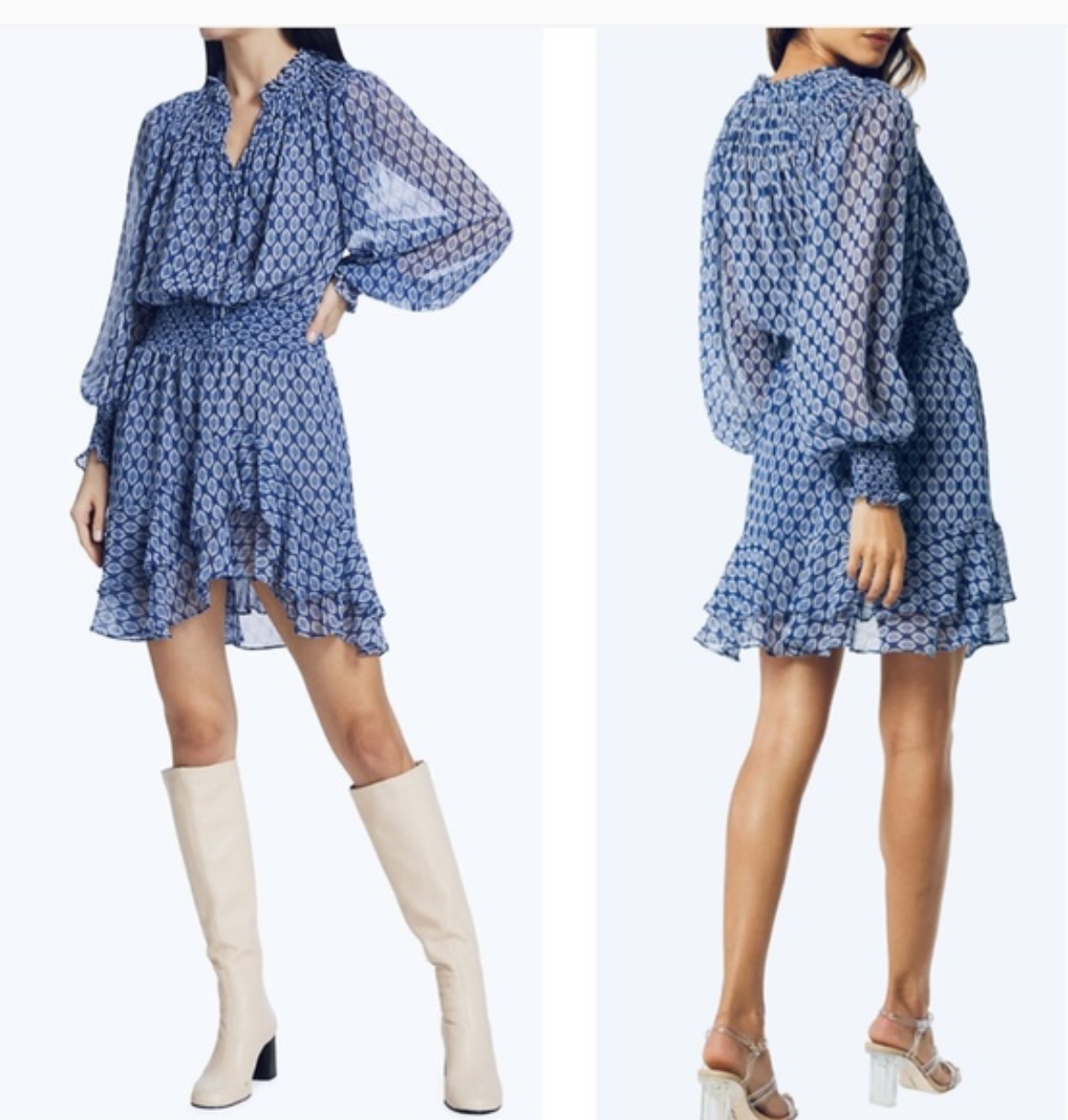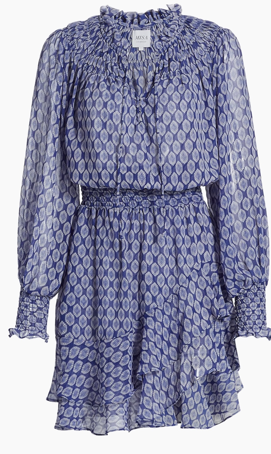Misa Los Angeles Almaha Dress. Polyester blend. Made in USA. Partially lined. Pull-on styling with smocked waist. Split neckline with tie accent. Chiffon fabric with smocked cuffs.