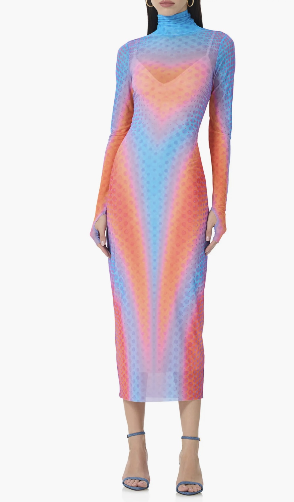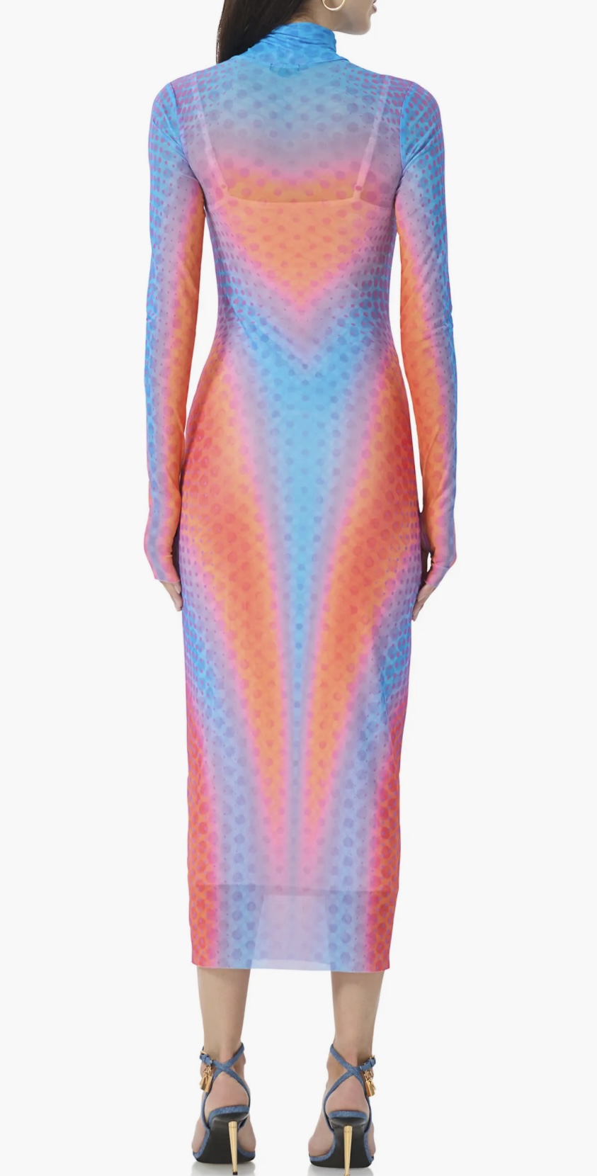 This eye-catching bodycon dress features long sleeves and a high neckline, with a vibrant gradient pattern that transitions from blue at the shoulders to orange and pink hues at the waist, then to purple and back to blue at the hem. The textured, honeycomb-like fabric adds depth and dimension, while the distinctive sheer details provide a modern and edgy touch. Perfect for making a bold fashion statement, this dress combines striking colors with unique design elements, making it standout.