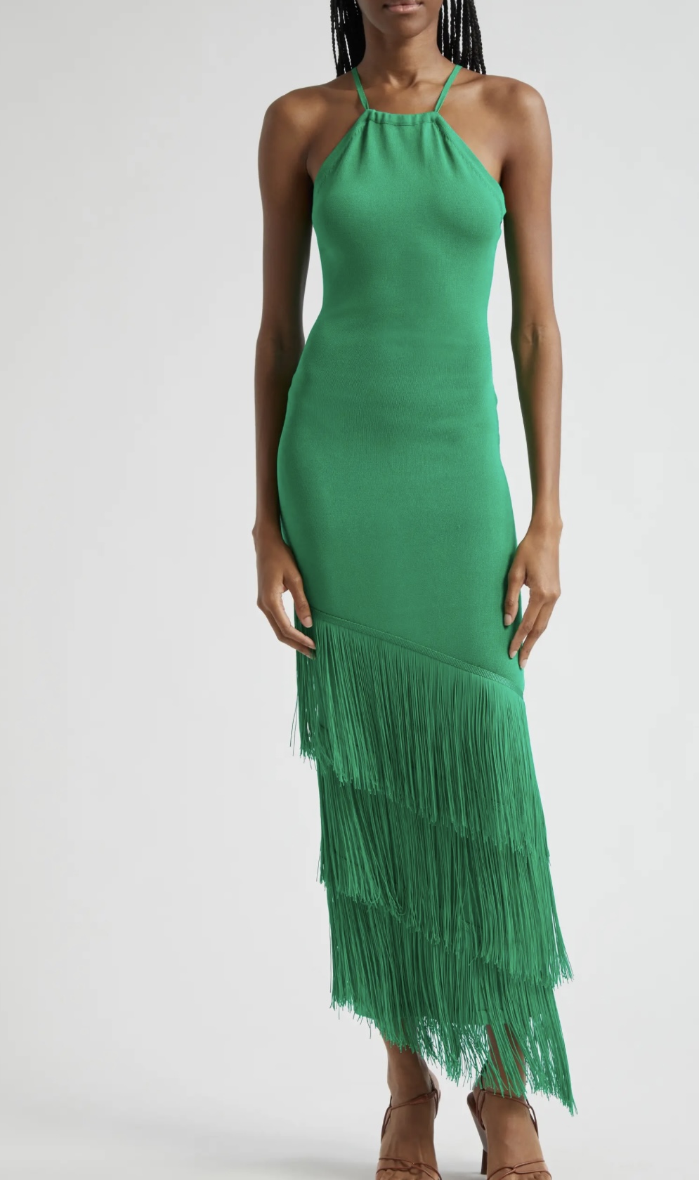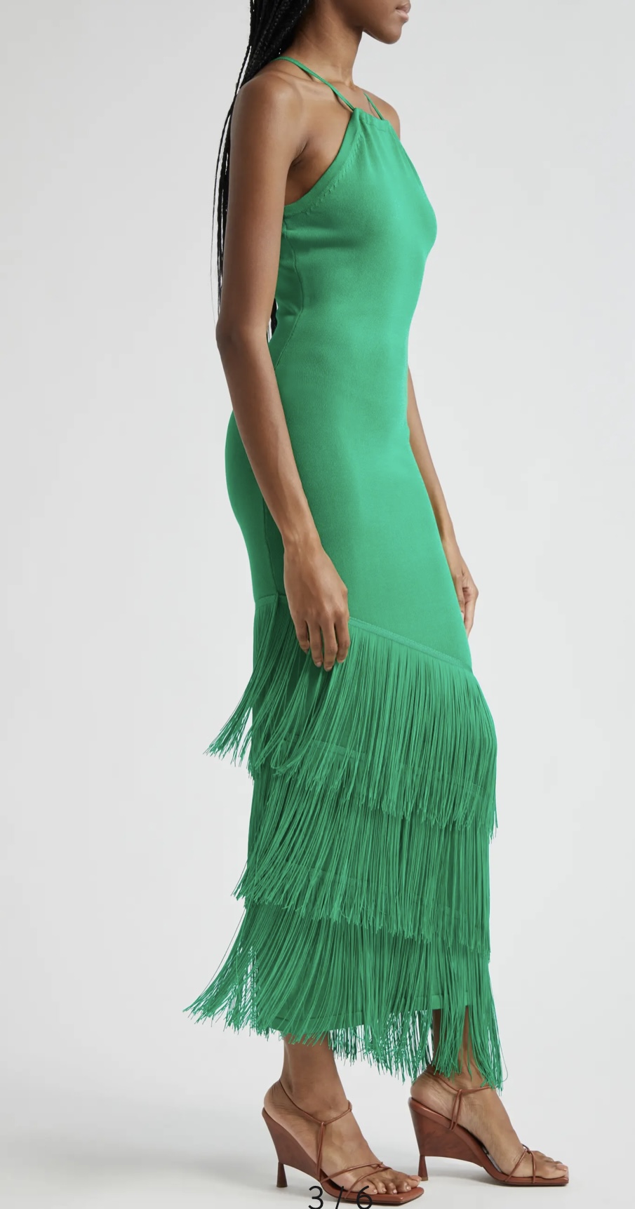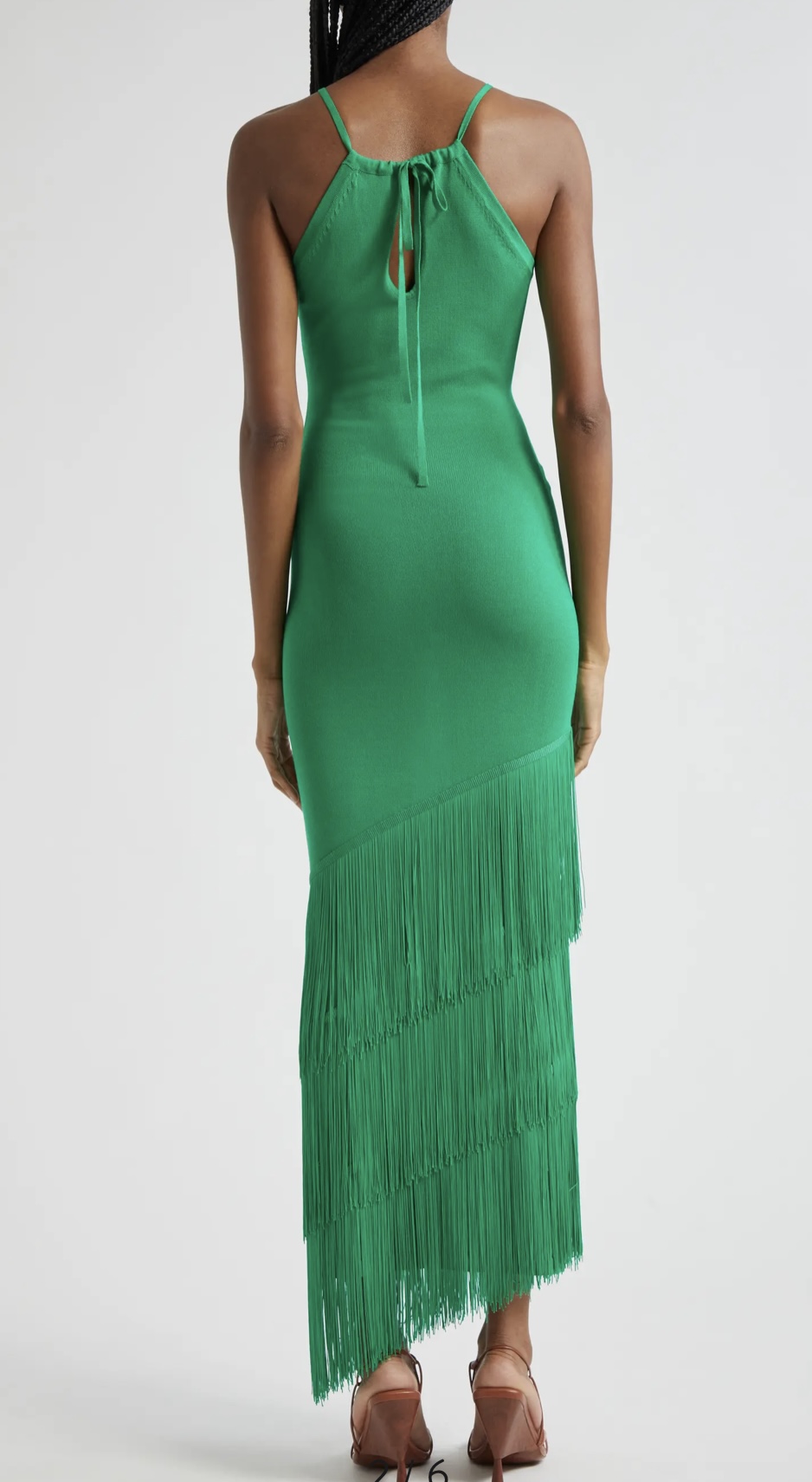This vibrant green halter neck dress features a slim fit that contours the body beautifully. Starting at mid-thigh length, the dress is adorned with eye-catching fringe details that continue to the hem, adding dynamic movement and a playful edge. The fabric has a subtle texture, enhancing the overall depth and appeal of the garment. Perfect for special occasions or events, this dress is a standout piece for those looking to make a bold fashion statement.
