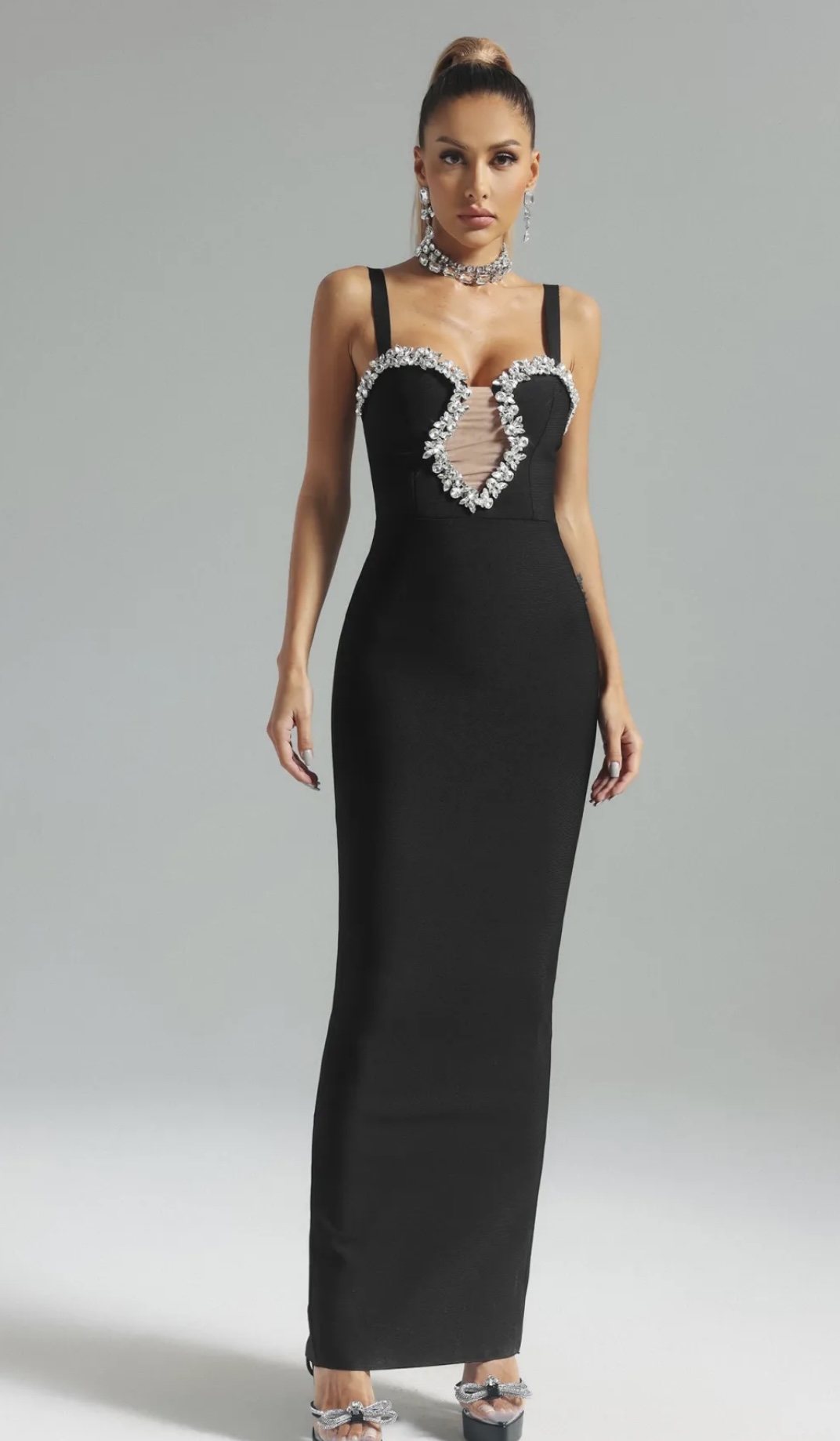 Make a statement at your next formal event with this stunning black evening gown. Featuring a form-fitting silhouette, this dress boasts thin shoulder straps and a dramatic sweetheart neckline adorned with intricate silver crystal embellishments. The structured bodice ensures a flattering fit, while a sheer panel adds a touch of modesty to the deep V-neckline. Perfect for making a bold yet elegant impression, this gown is ideal for any special occasion.