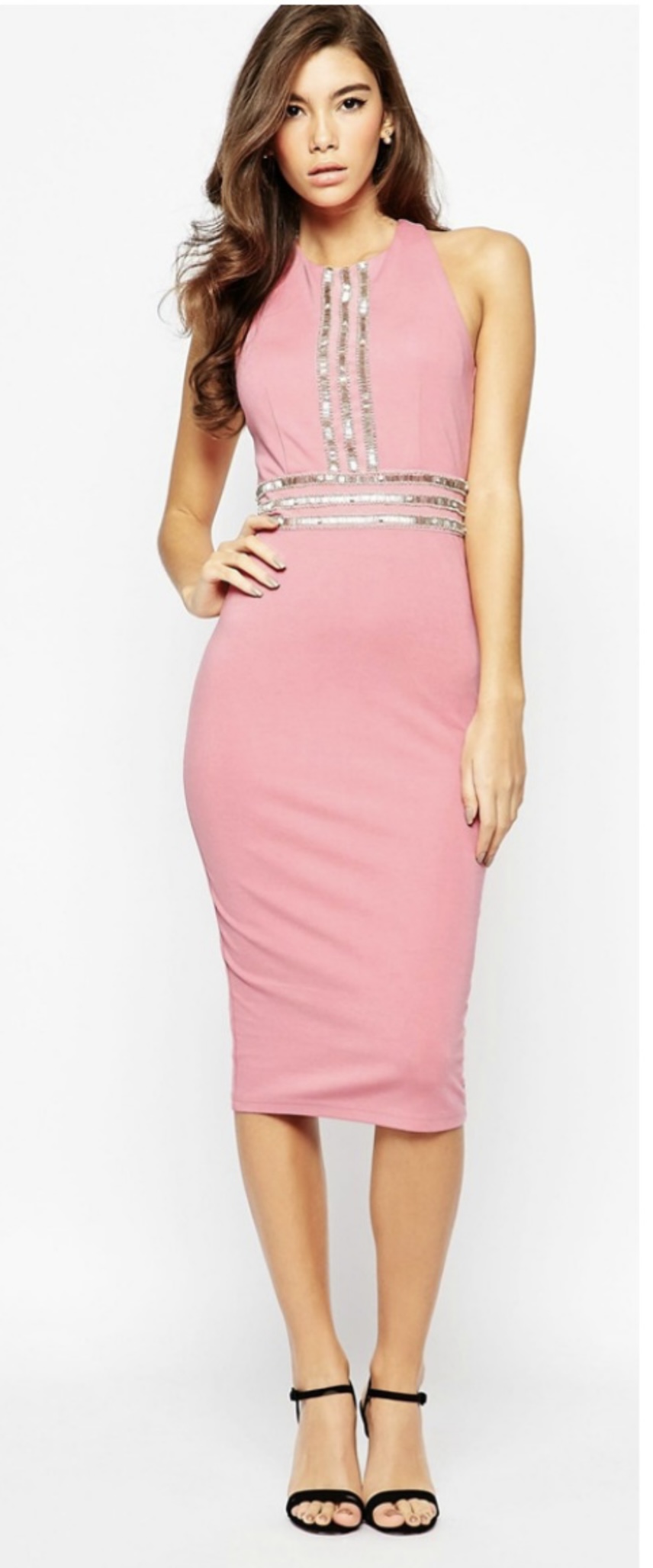 This sleeveless, knee-length bodycon dress in a soft pink hue is perfect for any special occasion. It features a high neckline and is adorned with silver embellishments that run vertically down the center of the bodice and horizontally around the waistline, creating a flattering cinched effect. The smooth fabric hugs the body’s contours, emphasizing an hourglass silhouette. Paired with black ankle-strap heels, this dress exudes elegance and femininity, making it an ideal choice for evening wear or glamorous events.