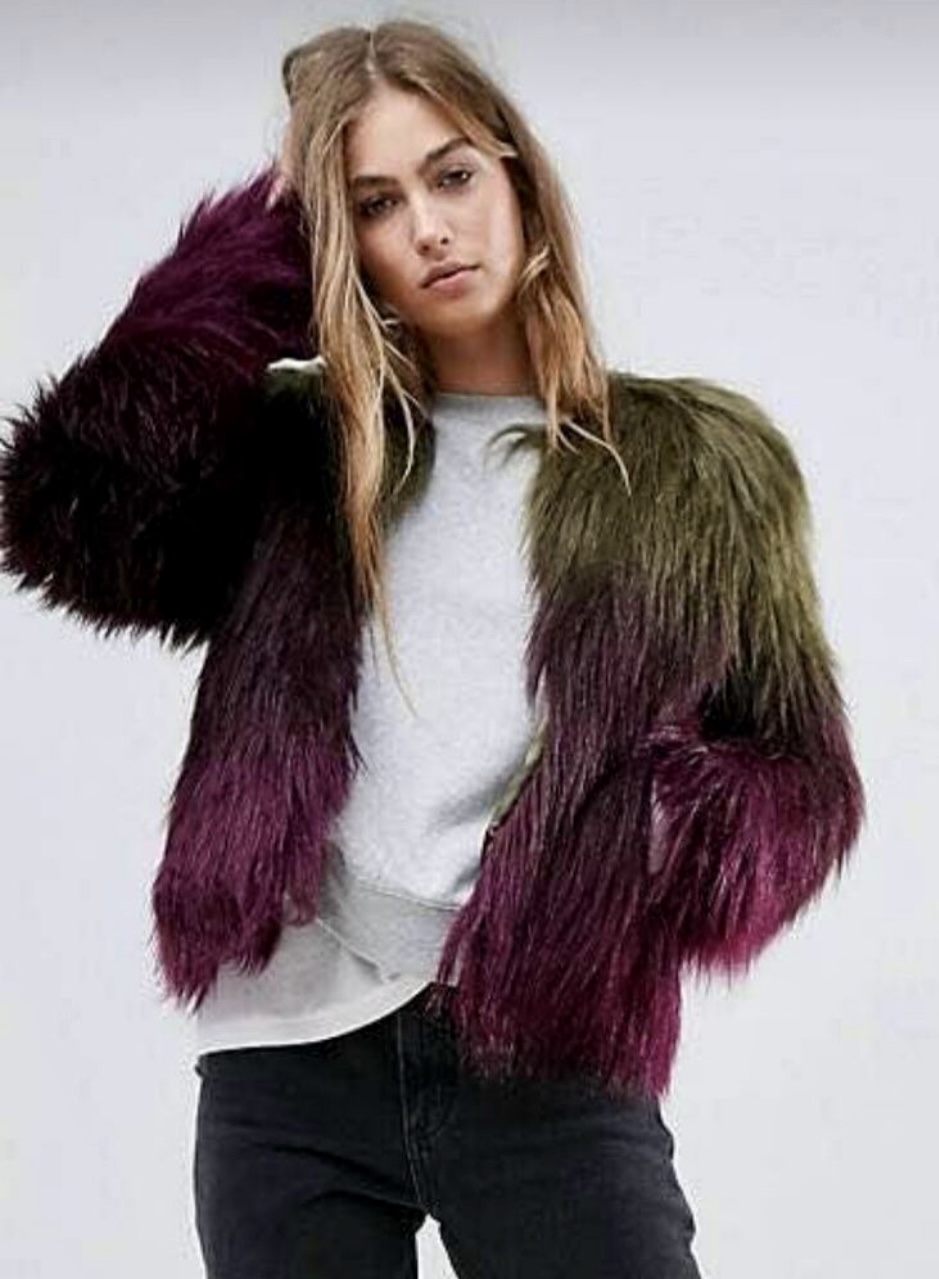This eye-catching coat features long, shaggy fur in bold, alternating vertical stripes of deep purple and olive green. The relaxed fit and open front design, without visible closures, create a casual yet striking look. Perfect for making a statement, this piece adds an edgy, eclectic touch to any outfit. Ideal for those looking to stand out, it pairs well with simple basics to let its vibrant colors and unique texture shine.