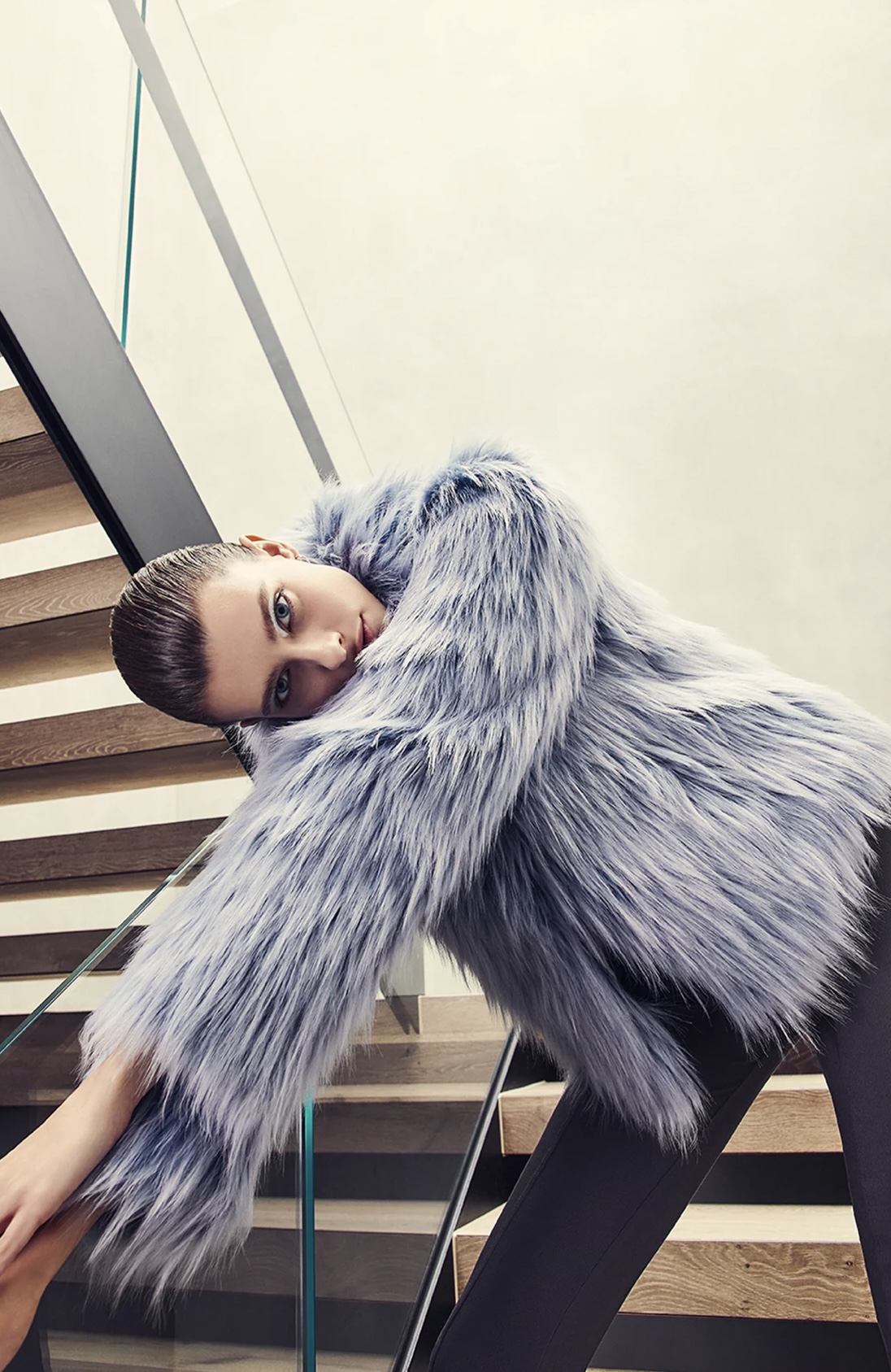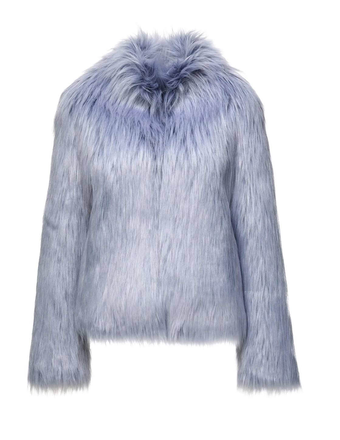 This stylish knee-length coat features a fluffy texture in shades of light blue and grey, giving it a cool-toned and luxurious appearance. Made from faux fur, it offers both warmth and a touch of elegance. Perfect for adding a statement to your winter ensemble, this coat combines comfort with high-fashion appeal. Ideal for those looking to stay cozy while making a stylish impression.