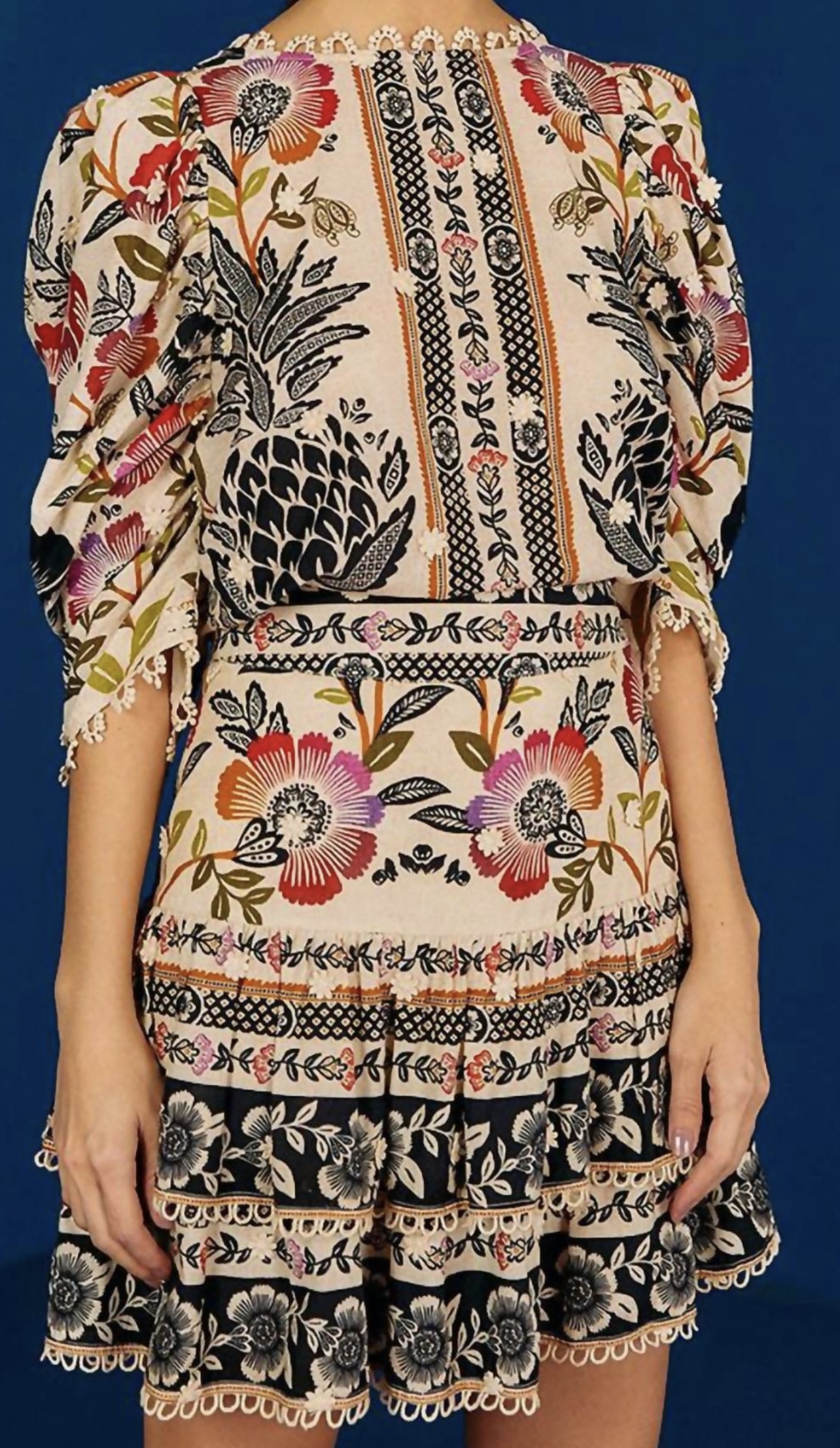 Farm Rio Romantic Garden skirt and blouse. Slim waistband with straight cut and puffed sleeves.