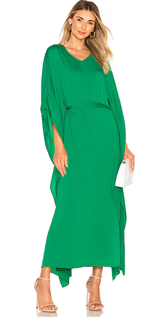 This vibrant green kaftan features a relaxed fit with a V-neckline and draping dolman sleeves, adding an elegant flow to the garment. It is ankle-length with a subtle asymmetrical hem, giving it a modern touch. The fabric appears smooth and lightweight, ensuring comfort and ease of movement. Perfect for various occasions, from casual outings to more formal events, this kaftan combines style and versatility effortlessly.