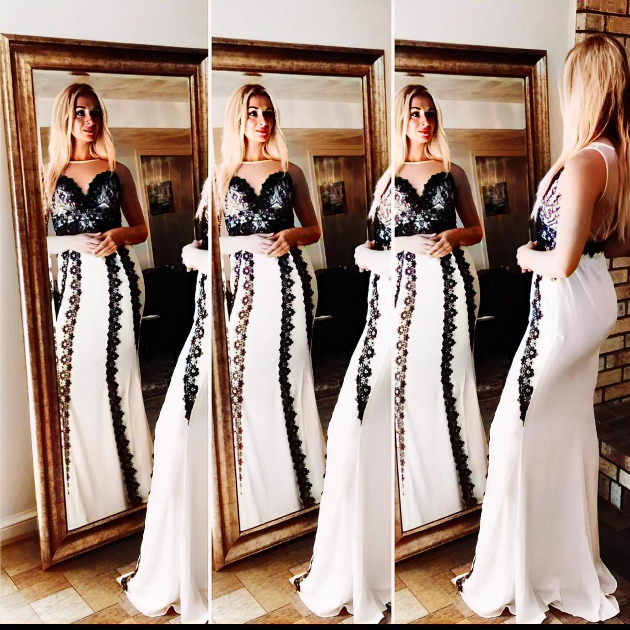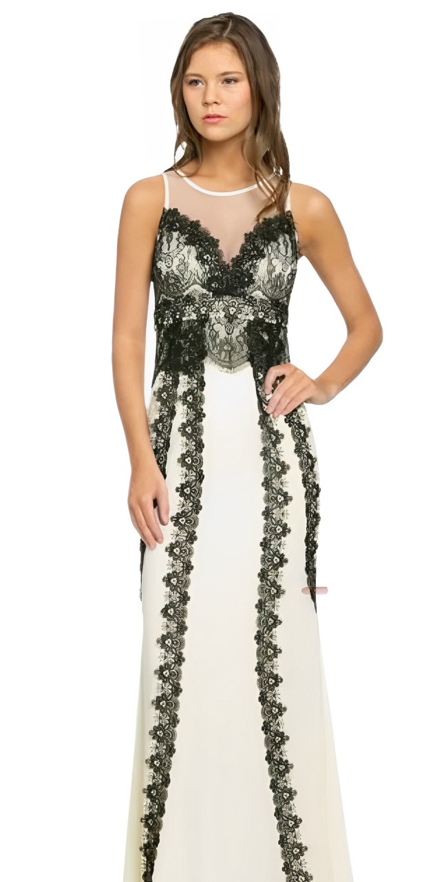 This stunning gown features a white base color, beautifully contrasted by intricate black lace appliques. The lace detailing is concentrated on the bodice, forming a deep V-neckline that extends into thin, delicate straps over the shoulders. The black lace cascades down the length of the dress in two vertical panels, accentuating the figure and adding depth to the design. Perfect for formal occasions, this dress combines classic elegance with modern detailing.