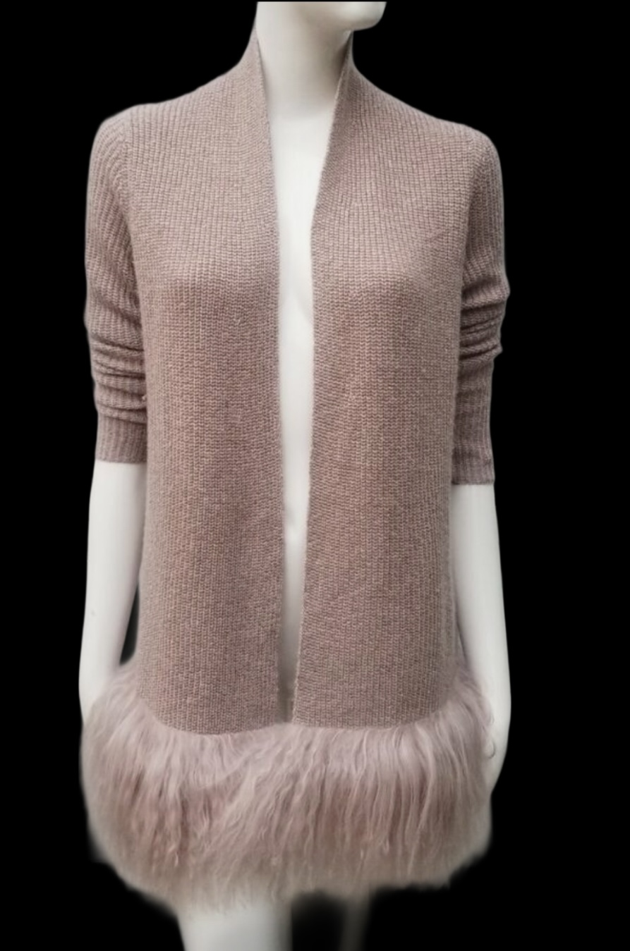 This soft pastel pink cardigan features a subtle heathered texture and an open front design, extending to mid-thigh length. The long sleeves and fluffy, feathery trim in a slightly darker shade of pink add a playful elegance to the overall look. Perfect for adding a touch of femininity and flair to any outfit, this cardigan combines comfort and style effortlessly. Ideal for layering, it can be paired with both casual and dressy ensembles.