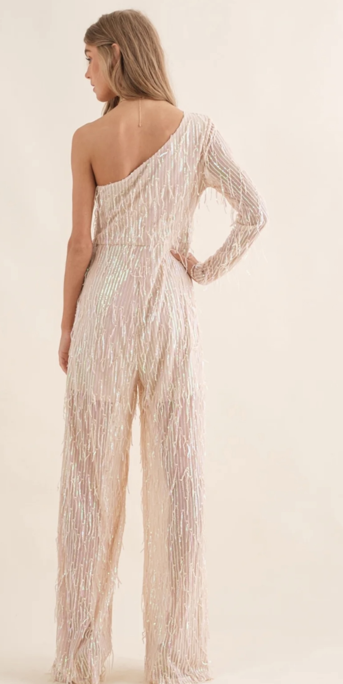 Sequin glitter fringe embellished one shoulder jumpsuit