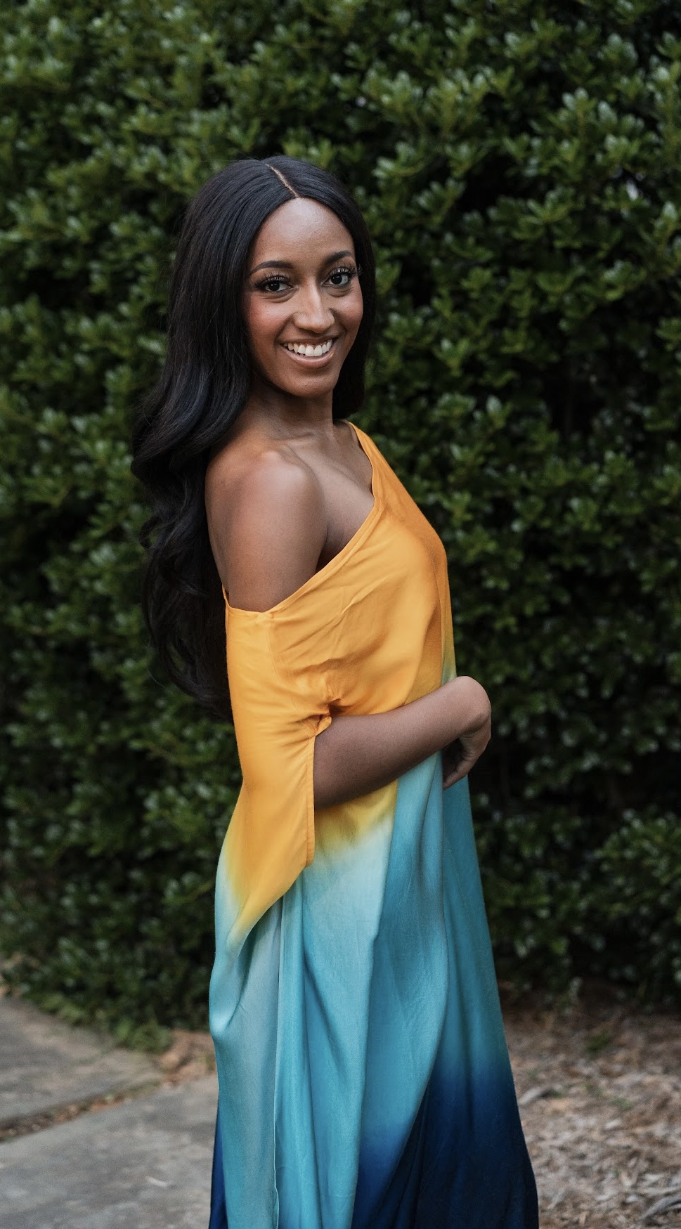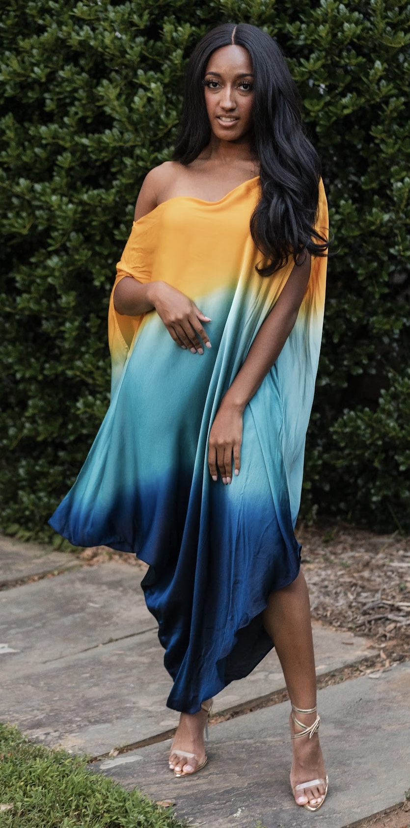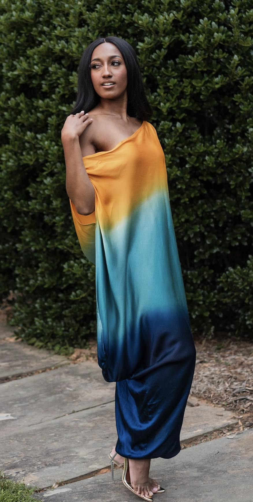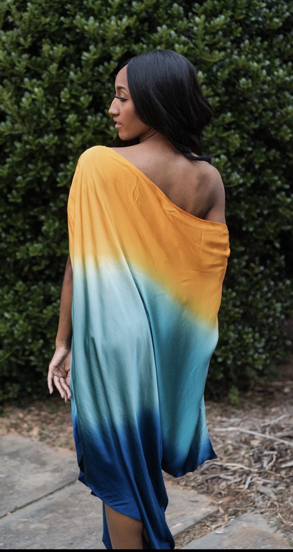 This is a sleeveless, full-length garment with a beautiful gradient color design. It starts with a vibrant yellow at the top and transitions into shades of blue and green towards the bottom. The neckline is a gentle scoop or cowl neck, draping loosely around the chest area. The fabric appears light and flowing, a soft and comfortable material.