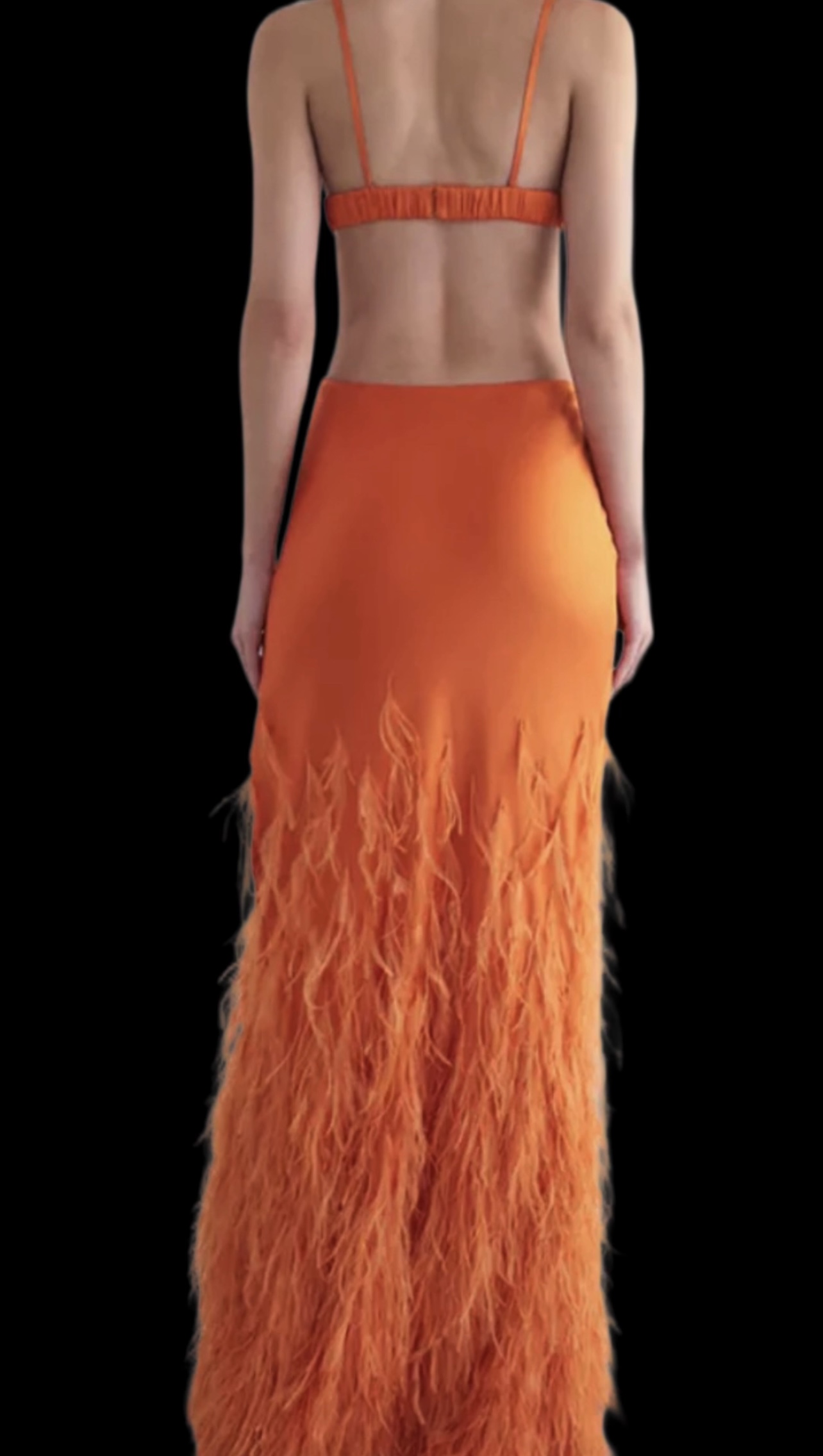 This elegant evening gown features a bold orange hue with a gradient effect that transitions into a fiery feather embellishment at the hem. The dress boasts a plunging V-neckline, supported by delicate spaghetti straps, adding a touch of glamour. The silhouette is form-fitting, flowing seamlessly down to the floor-length ostrich feather skirt, which creates dramatic movement and texture. This dress is designed to make a statement with its vibrant color and dynamic detailing, perfect for any formal event where fashion-forward elegance is desired.