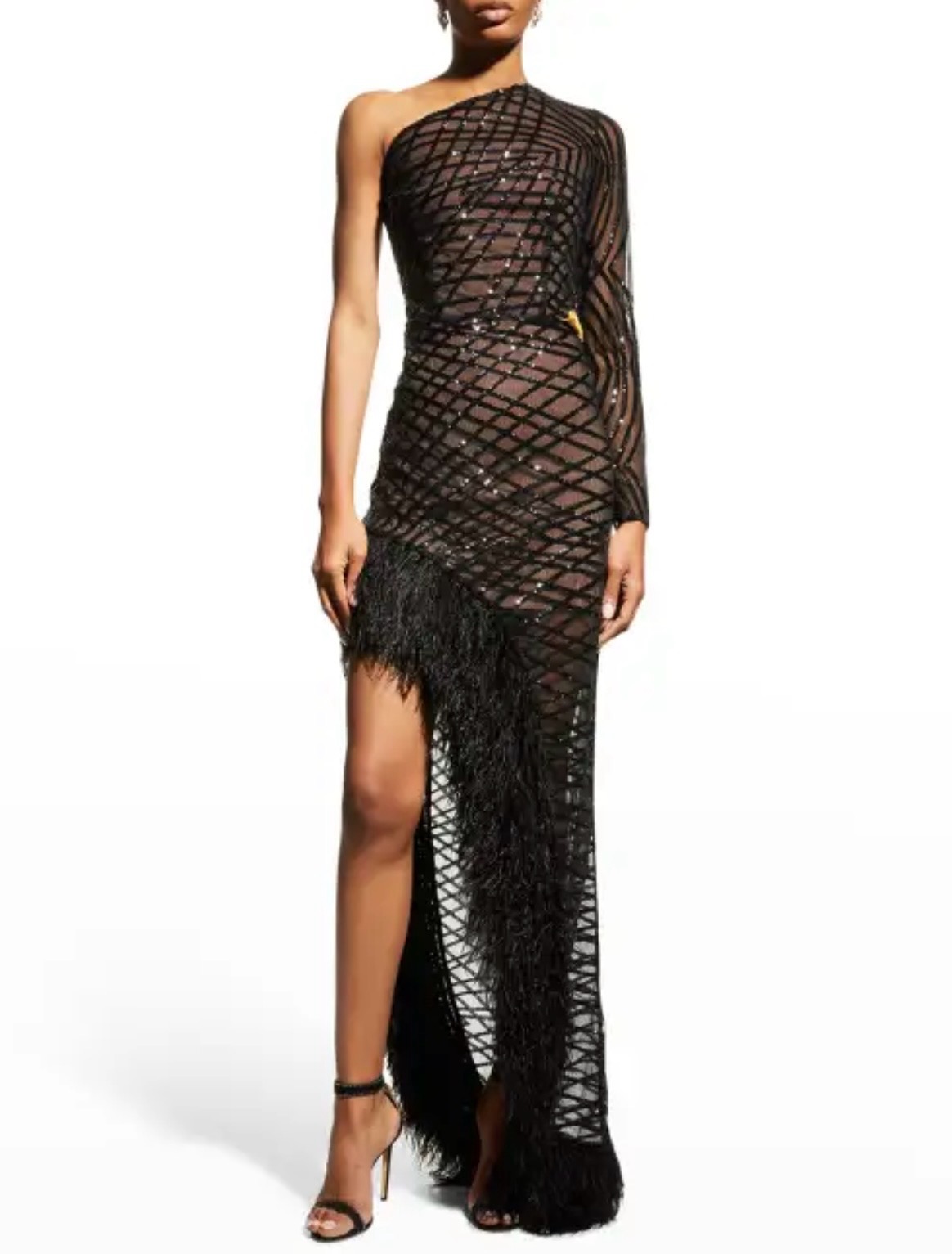 This stunning one-shoulder dress features a unique asymmetrical design with a sheer overlay adorned with a grid-like geometric pattern, creating an alluring see-through effect revealing the accompanying slip. Cinched at the waist with a solid band, it highlights the silhouette beautifully. The hemline is decorated with fringe detailing, adding movement and a playful edge to the garment. Combining modern style with a touch of flapper-inspired charm, this dress is perfect for fashion-forward individuals seeking a statement outfit for special occasions.