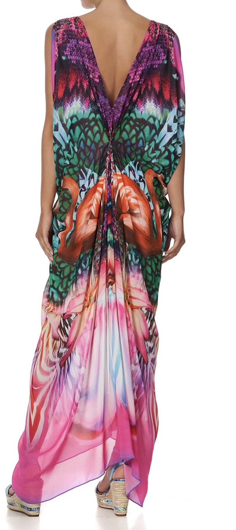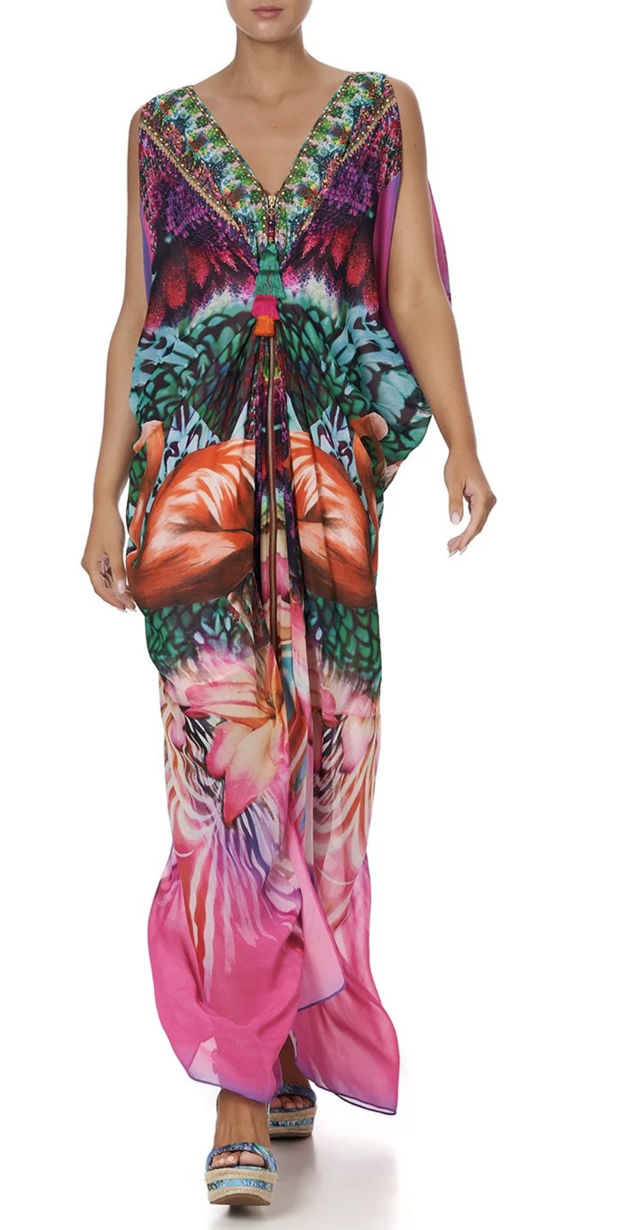 Embellished Kaftan Dress with Tassels and embellishments and bright Camilla Awakened Utopia design.