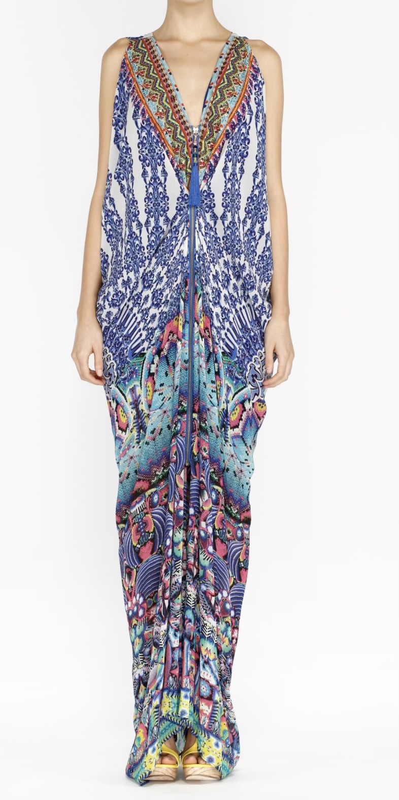 Camilla designer dresses are vibrant, bohemian creations featuring intricate prints, embellishments, and flowing silhouettes, inspired by global travel and exotic cultures.