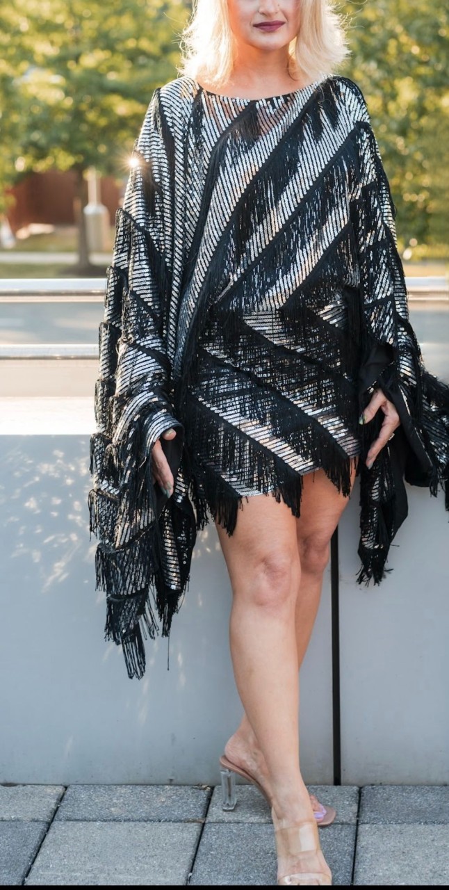 This sequin cape kaftan is a striking piece featuring diagonal stripes of shiny sequins on a predominantly black fabric. It has an open, flowing design with wide sleeves and fringe detailing along the hem and sleeve edges, adding movement and elegance. Perfect for occasions where style and comfort are key, this kaftan blends traditional comfort with a modern, glamorous twist.