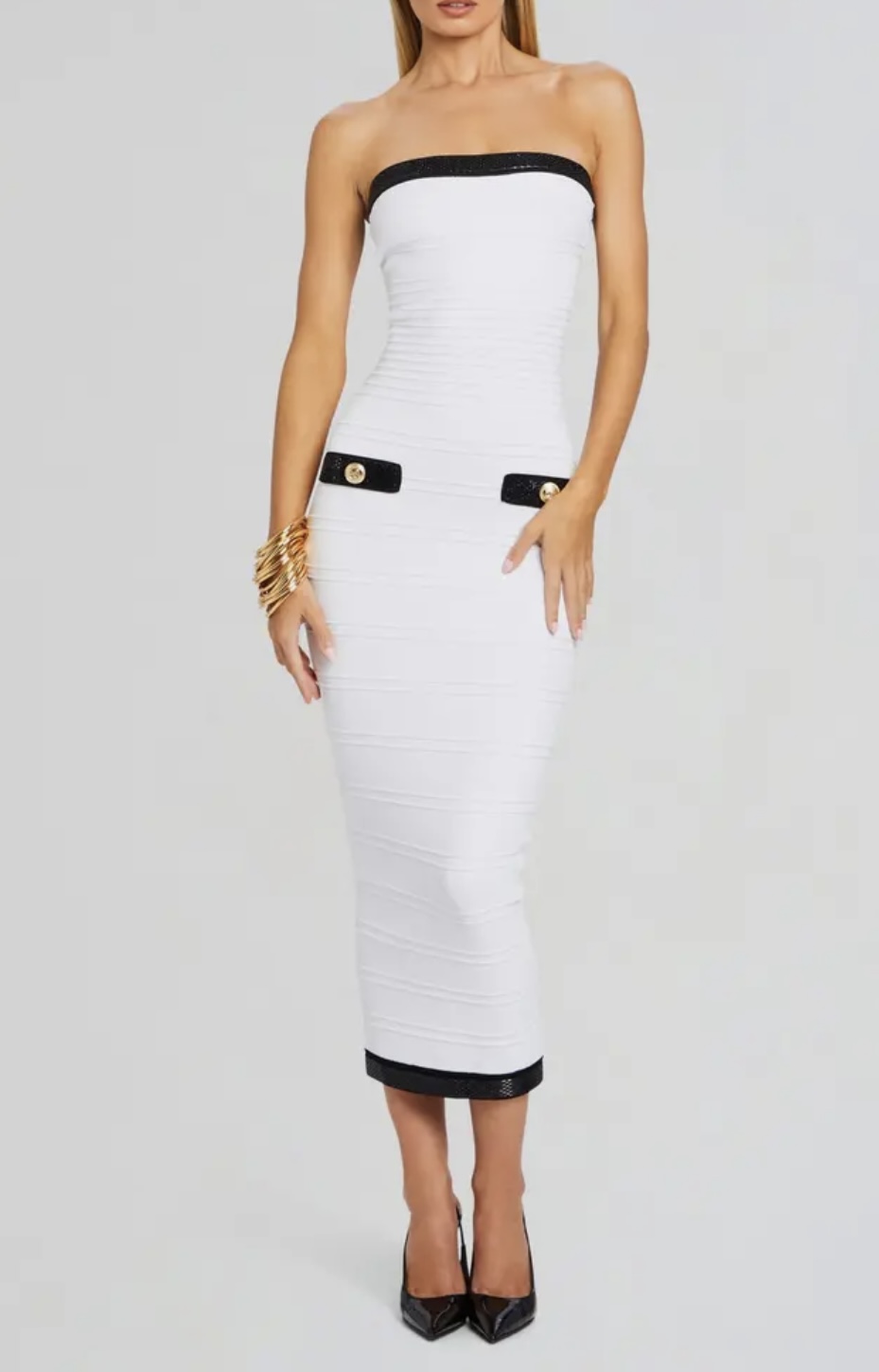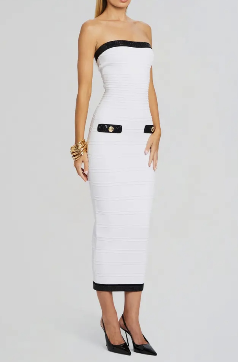 Turn heads at your next event with this stunning strapless bodycon dress. Featuring a classic white base with sophisticated black detailing, this knee-length dress is designed to contour your body for a flattering fit. The straight neckline adds a touch of elegance, while the two black horizontal bands at the waist, adorned with gold-toned buttons, accentuate your figure beautifully. The black band at the hem ties the look together, making this dress perfect for formal occasions or any event where you want to make a stylish statement.