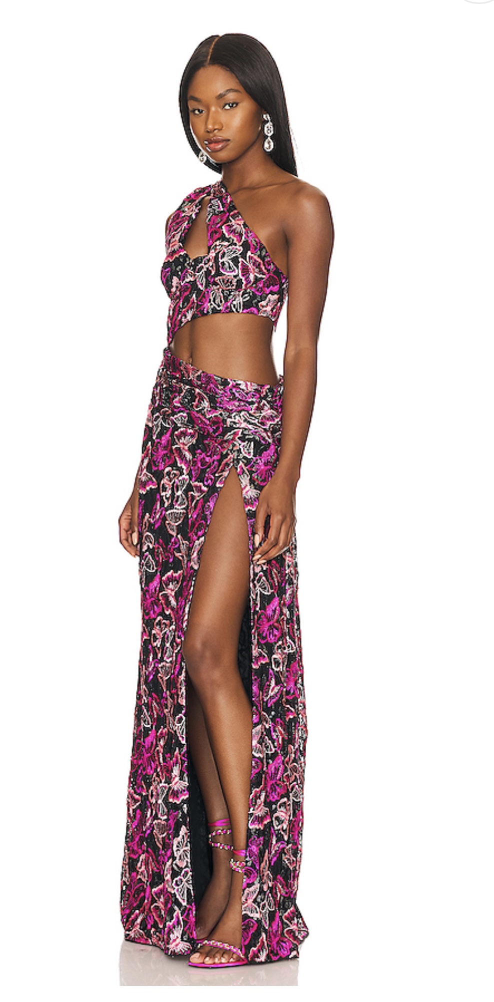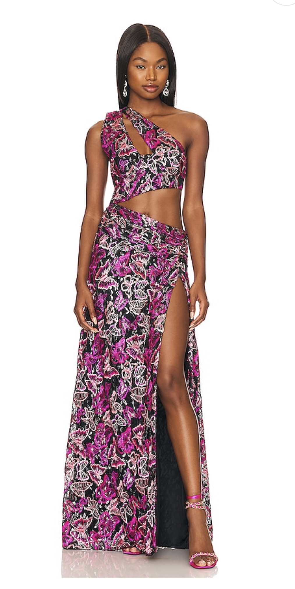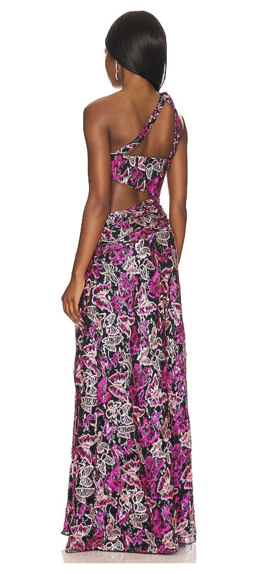 Lovers + Friends Elysian gown in mariposa multi-colored cutout design.