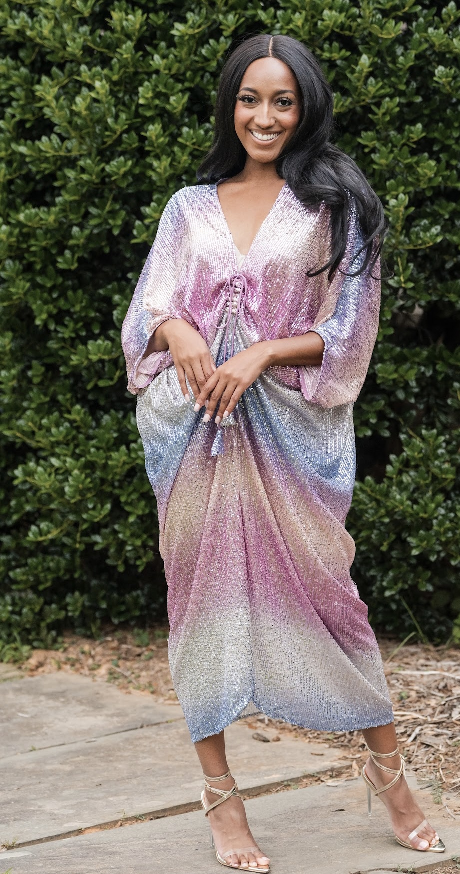 The Mandira Curtis ombré kaftan dress is a shimmering, multicolored knee-length dress with a cinched waist created by a drawstring. The dress features long, flowing sleeves and a V-neckline. It has an iridescent quality with hues of pink, blue, silver, and purple that change and sparkle as they catch the light.It’s a dazzling and eye-catching choice, perfect for a festive occasion or a night out!