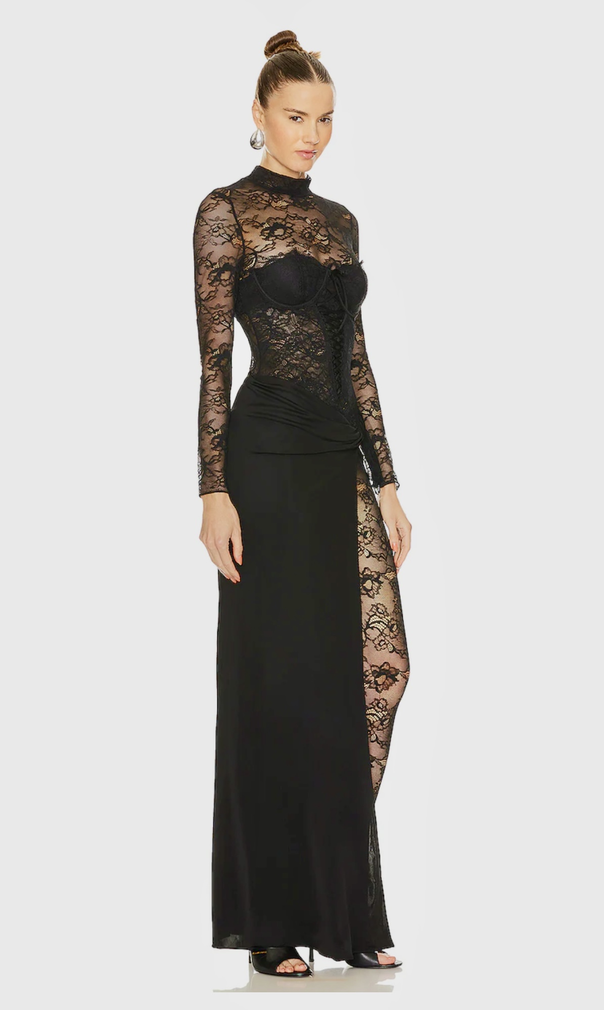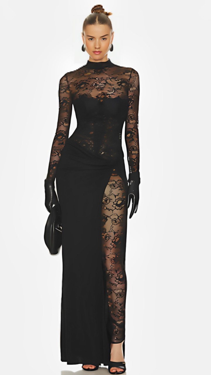 This elegant black lace evening gown features long sleeves and a floor-length design with a form-fitting silhouette that flares slightly at the bottom. The intricate lace pattern provides a semi-sheer look, complemented by a solid black underlay for modesty. The high, round neckline adds a classic touch, making it perfect for formal occasions. Accessories like long black gloves, a small clutch, and open-toed black heels with ankle straps complete the sophisticated ensemble, ideal for galas, weddings, or upscale parties.