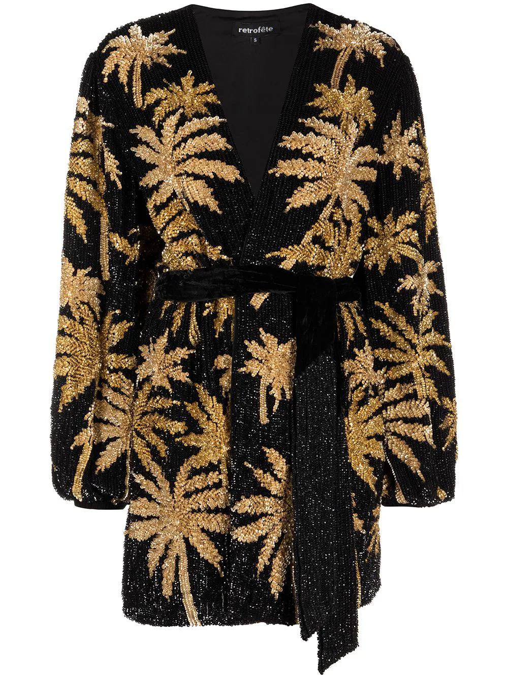 Black Retrofete Gabrielle Palm Tree Print Robe. Sequin with inner lining.