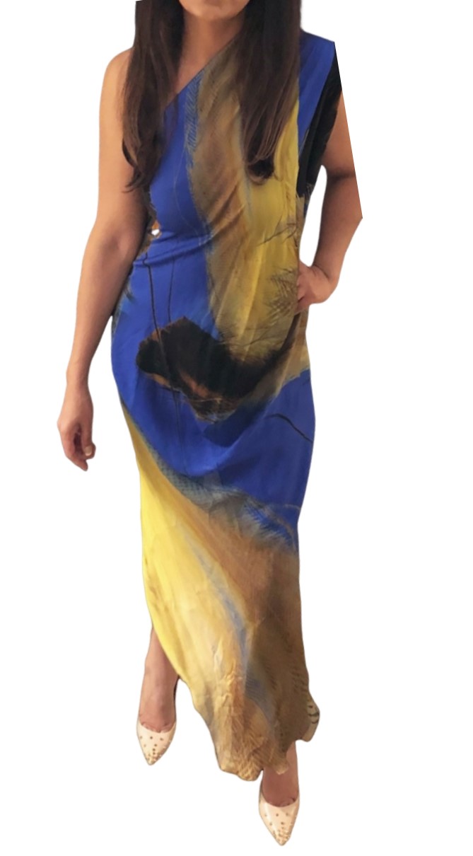 Mandira Curtis pre-stitched / draped sari with feather detailed cape and embellishments.
