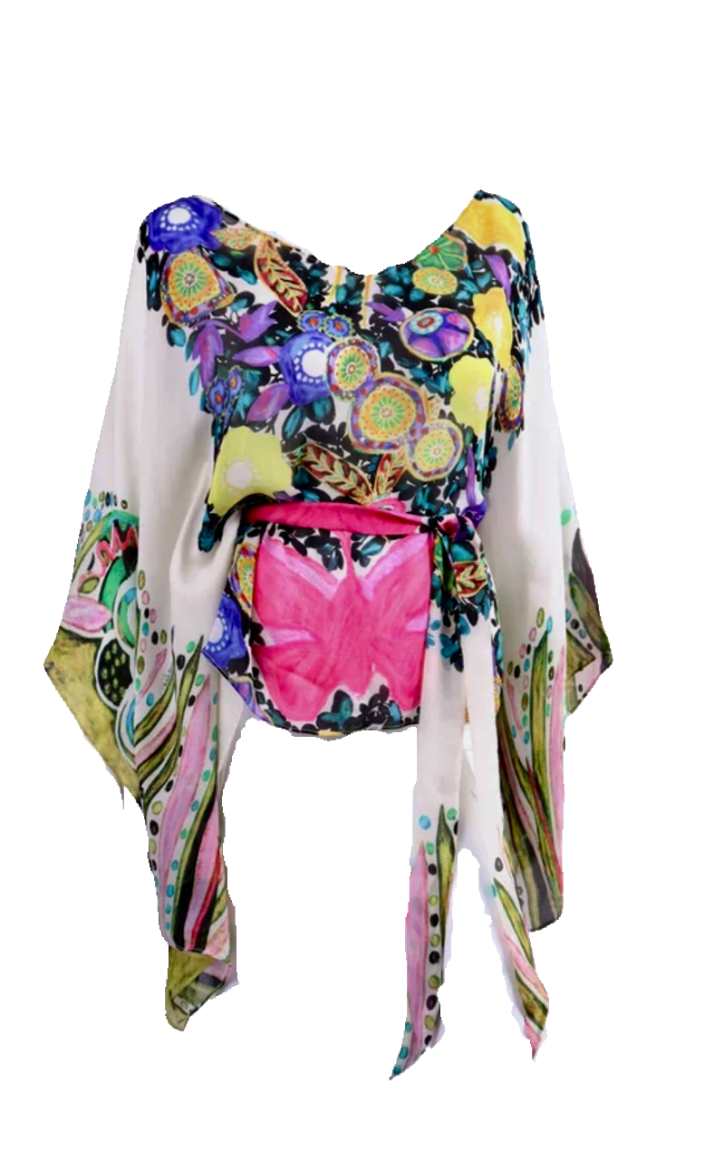 This Roberto Cavalli silk top has a vibrant, bohemian style with a wide neckline, long flared sleeves, and a cinched waist with a tie detail. The fabric features a mix of floral and abstract patterns in bright colors like purple, yellow, green, and pink. It’s a flowy, free-spirited piece that stands out with its lively design.