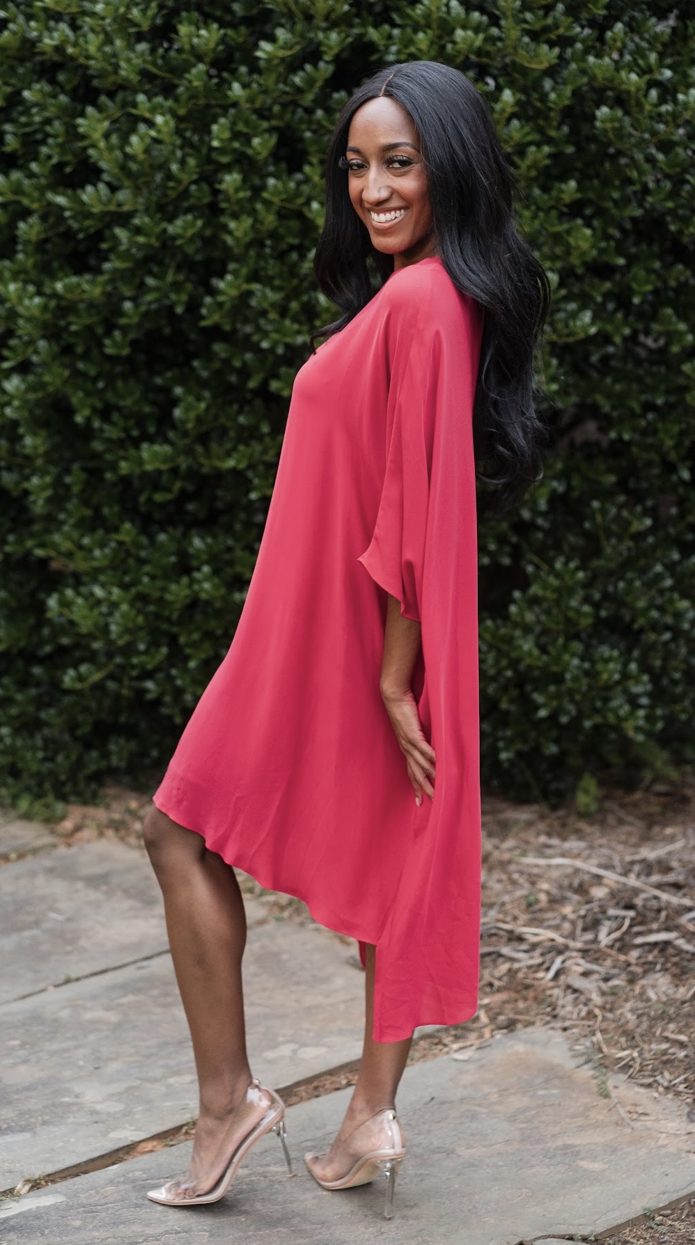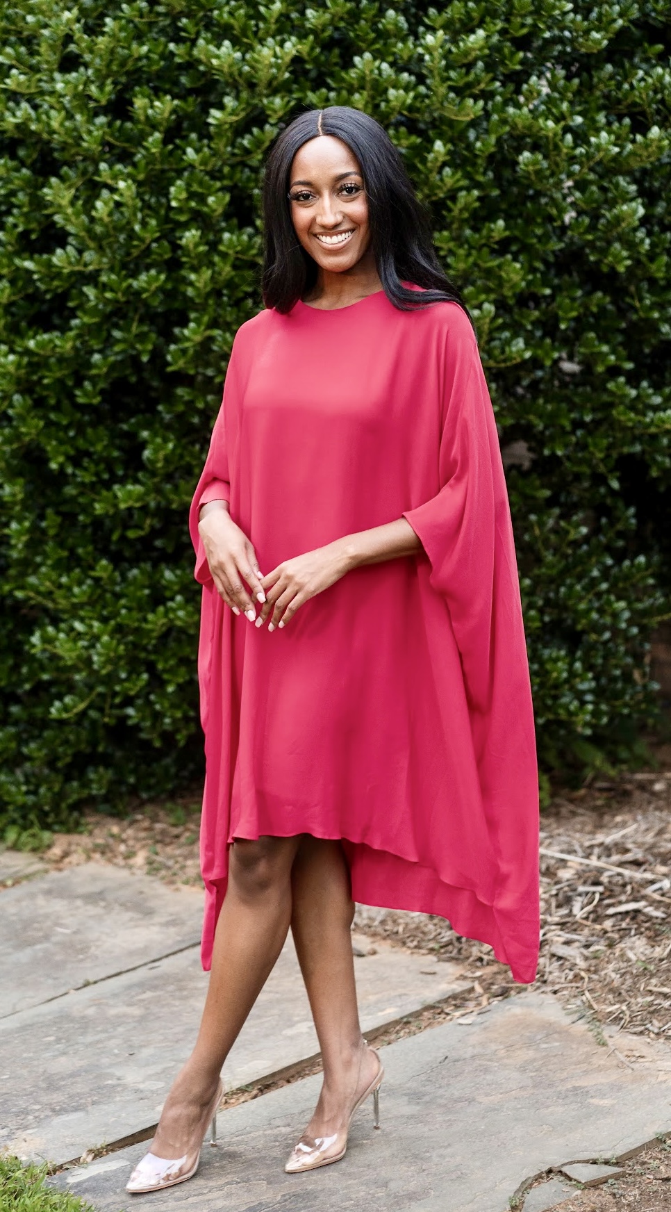 The dress is a knee-length, solid pink color with a loose, flowing silhouette. It features a round neckline and has an attached cape-like overlay that drapes over the arms and extends to the length of the dress. The fabric is lightweight and suitable for formal or semi-formal occasions.
