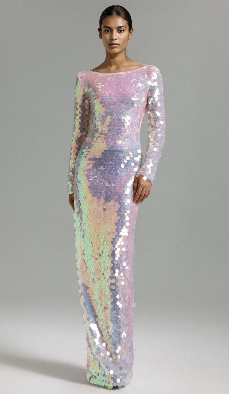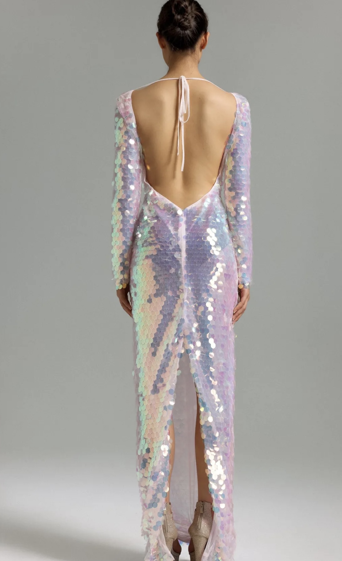 This stunning floor-length gown is designed to turn heads at any formal event. Featuring long sleeves and a captivating open back with a delicate tie closure around the back of the neck, this dress combines elegance with a touch of allure. The fabric is adorned with large, iridescent sequins that shimmer in hues of pink, purple, green, and blue, creating a mesmerizing effect as they catch the light. The deep V-neckline at the back and the high slit on one side add to its sophisticated charm, making it perfect for making a grand entrance. Ideal for those who want to make a statement, this dress is both glamorous and eye-catching.