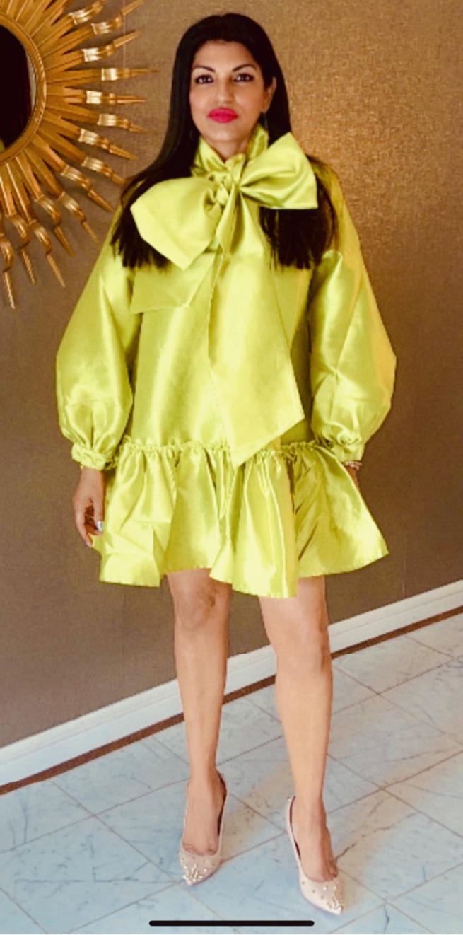 The dress is a vibrant green mini dress with dramatic puff sleeves and a large bow at the neckline. It has a cinched waist and a ruffled hemline, giving it a playful and eye-catching look. The fabric with a satin-like sheen, adds to its bold and stylish design.