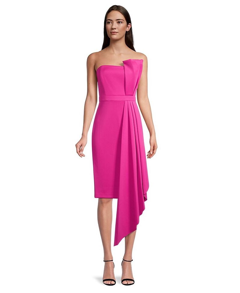 Make a bold statement before ever saying a word when you enter wearing this brilliantly colored strapless cocktail sheath with sculpted, asymmetrical detailing