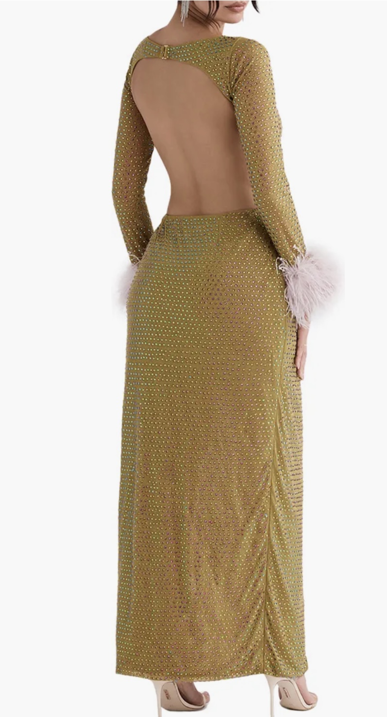 House of CB Gina rhinestone feather trim long sleeve cutout cocktail dress. This stunning floor-length gown features long sleeves and a high neckline, perfect for a sophisticated look. The golden fabric is adorned with rhinestone to give it a shimmering pattern that adds a touch of sparkle. The dress boasts unique cut-out details at the waist and a twisted knot at the center front, just below the bust line, creating a flattering silhouette. A high slit on one side of the skirt reveals one leg, adding a bold element to the design. The sleeves are finished with fluffy, light-colored feather trim, bringing a playful elegance to the overall look. This dress is ideal for formal events or any occasion where you want to make a glamorous statement.