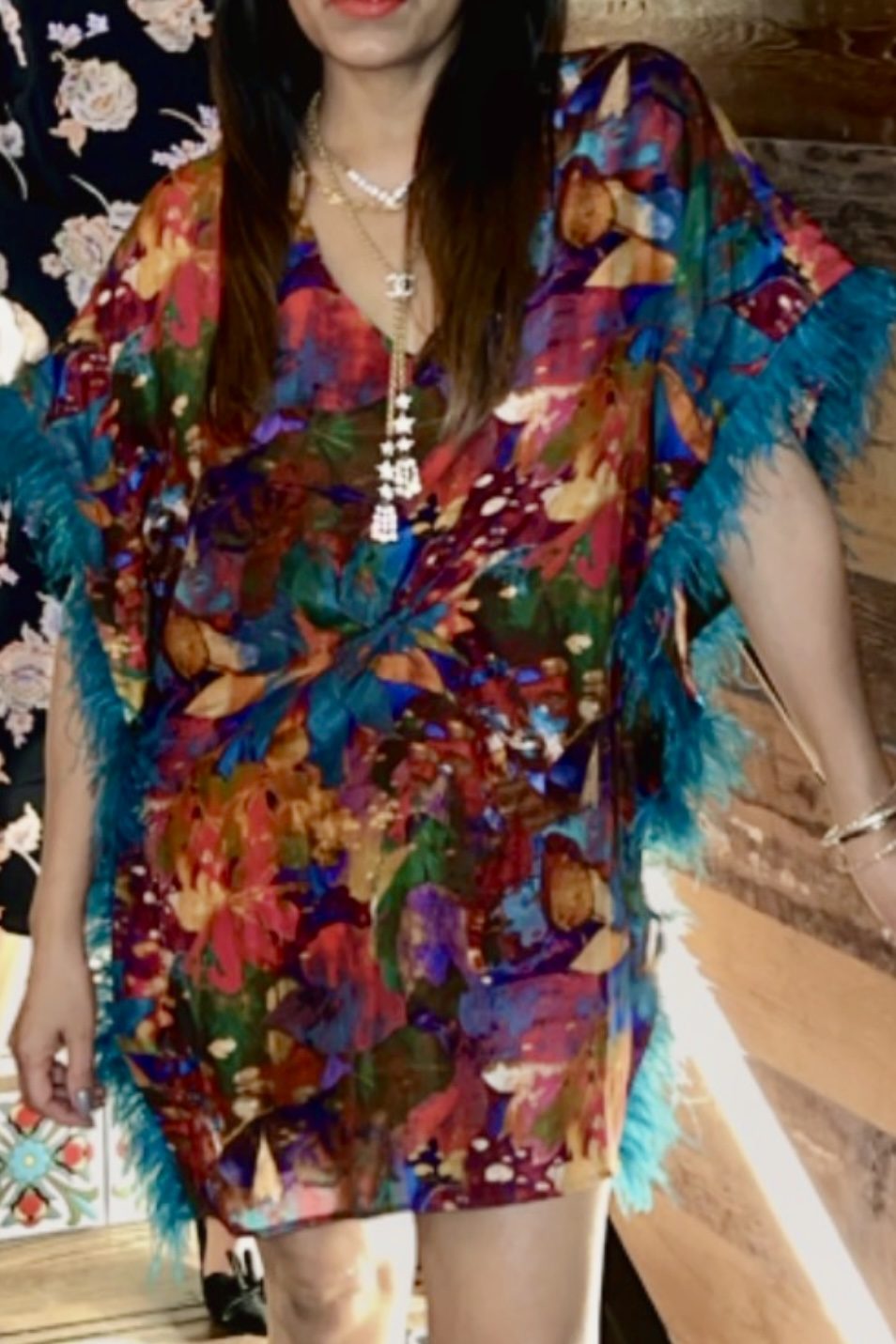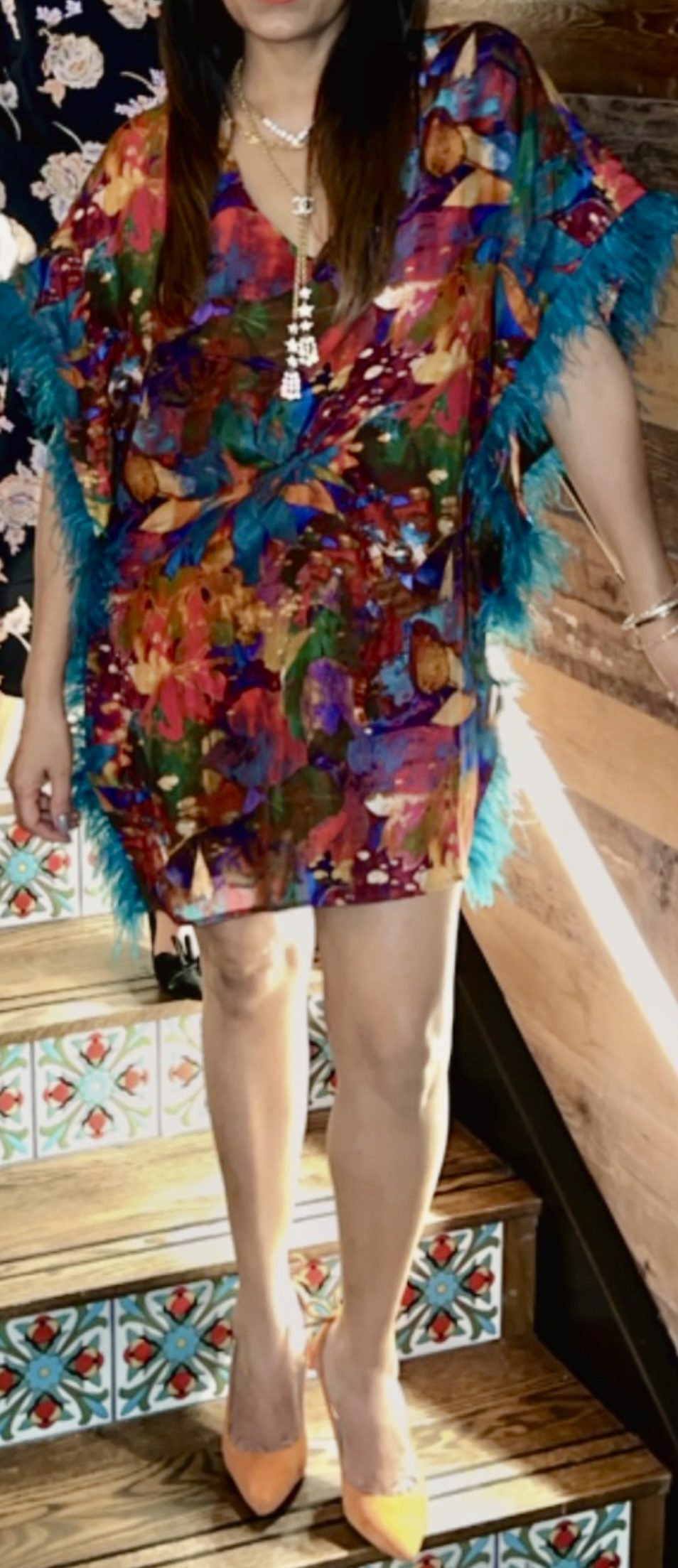 Maura Lotus feather dress. Slip on style, 100% silk with feather trim.