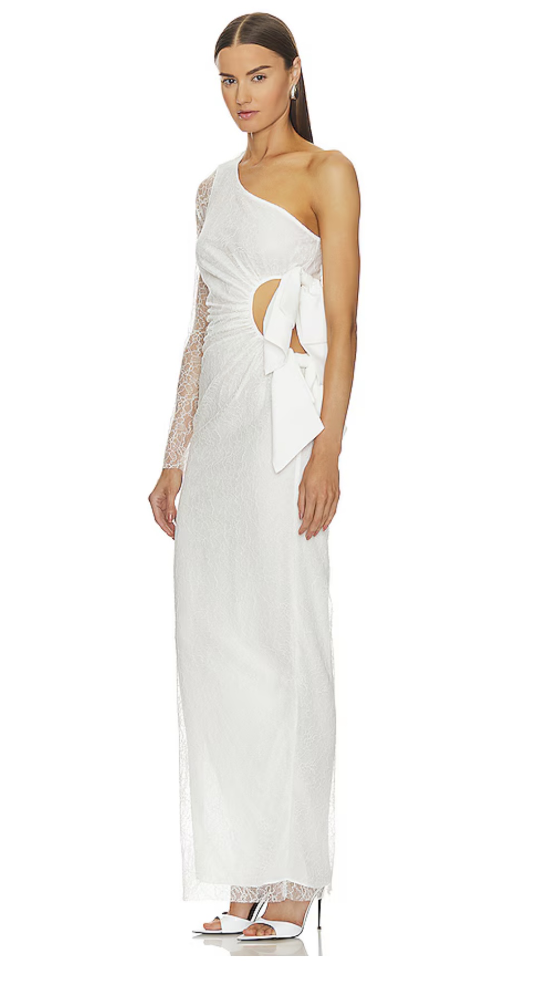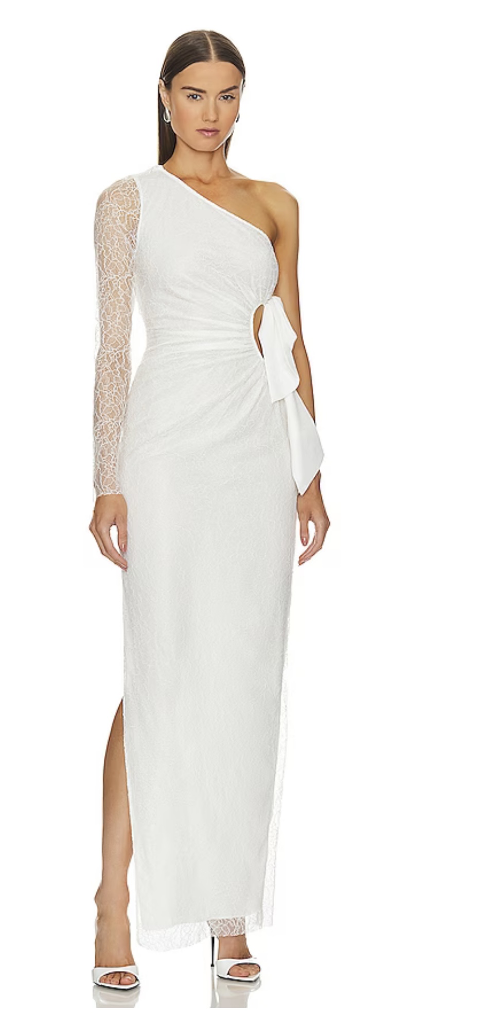 Lovers and Friends Hollyn gown in white with single lace sleeve, peek-a-boo tied off waist and side seam slit.