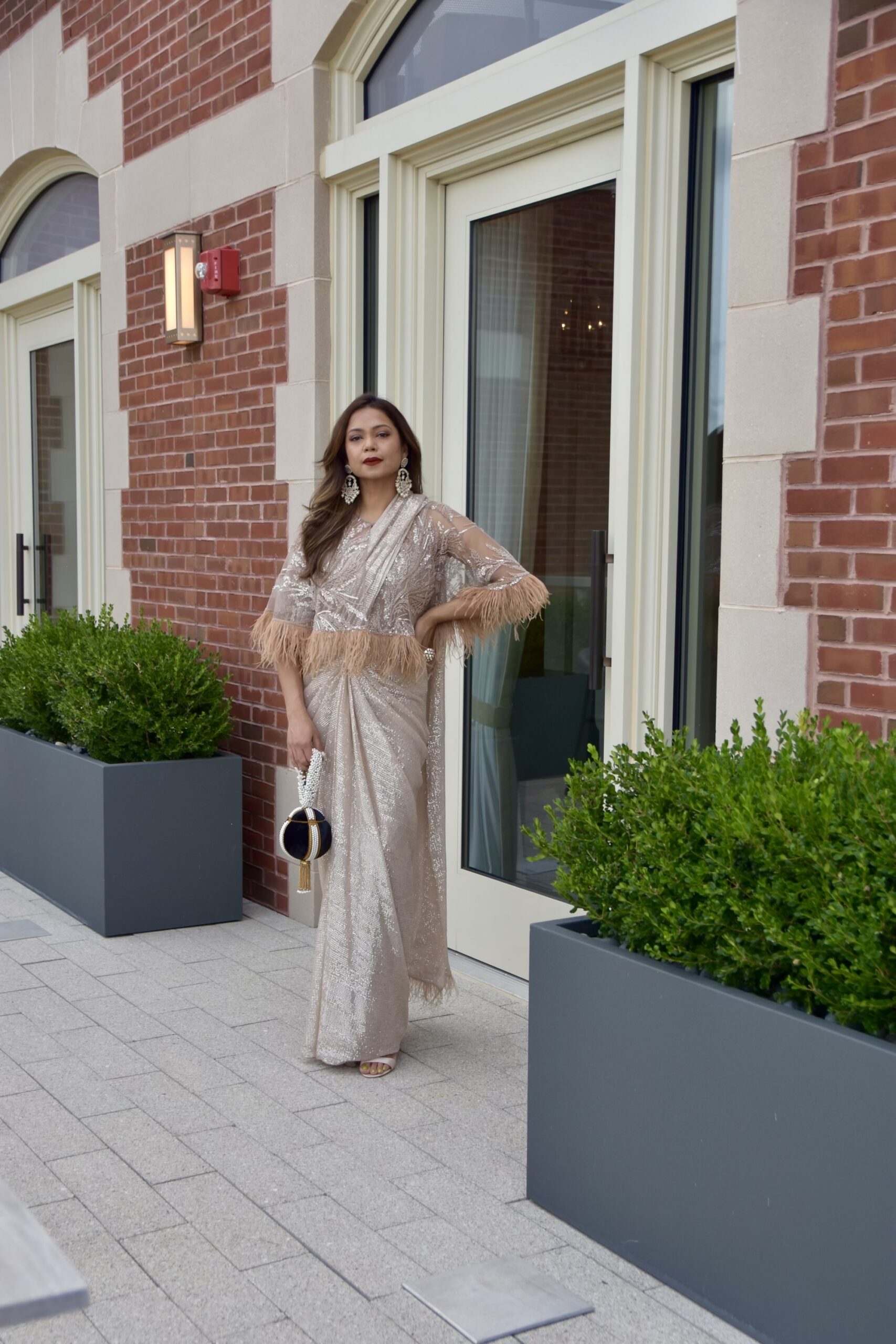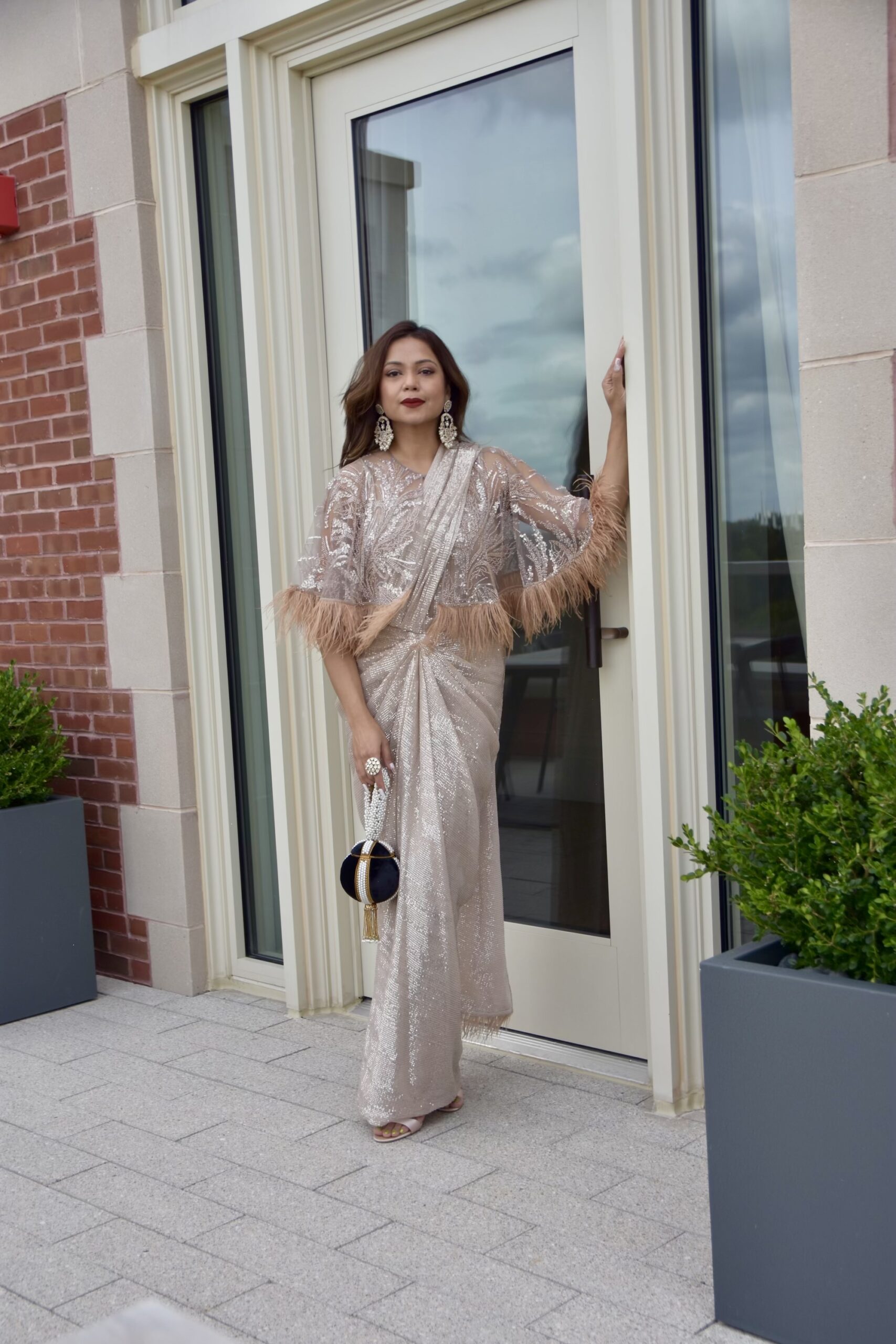 Mandira Curtis pre-stitched / draped sari with feather detailed cape and embellishments.