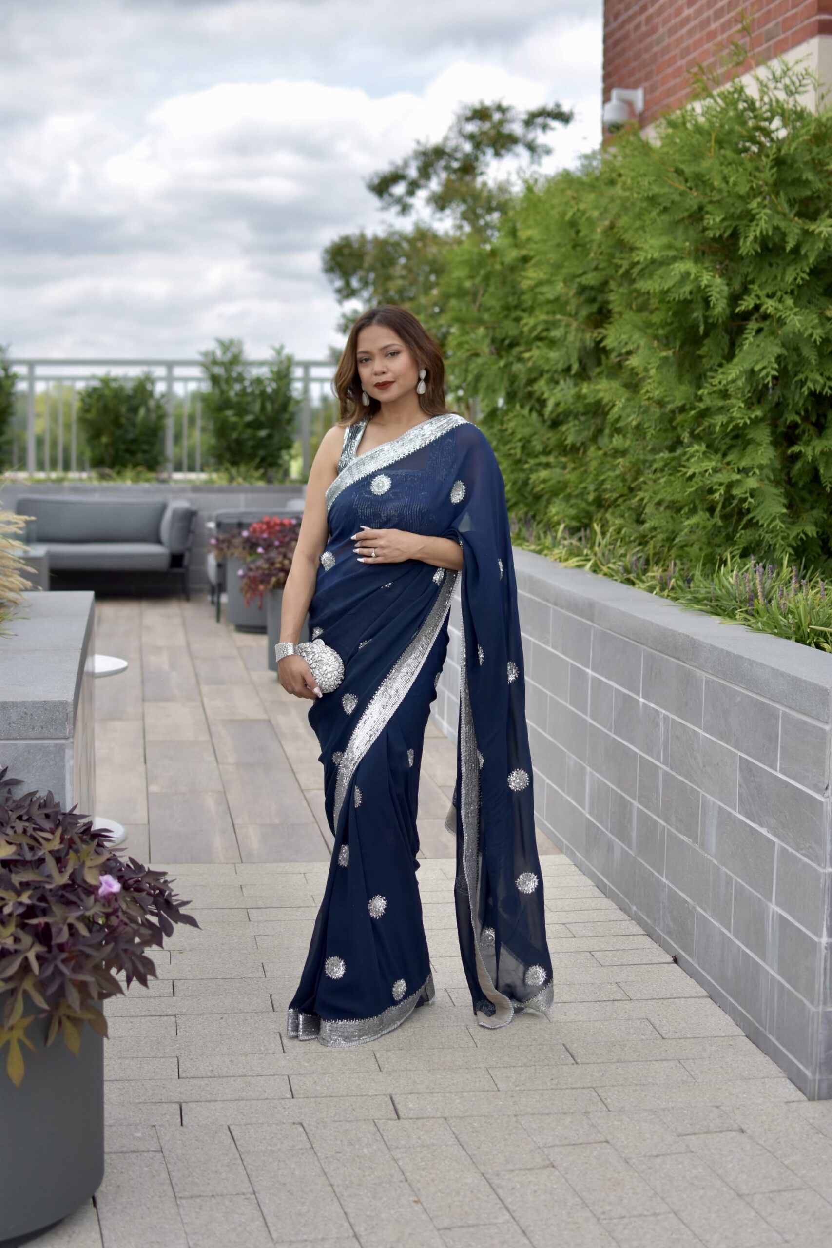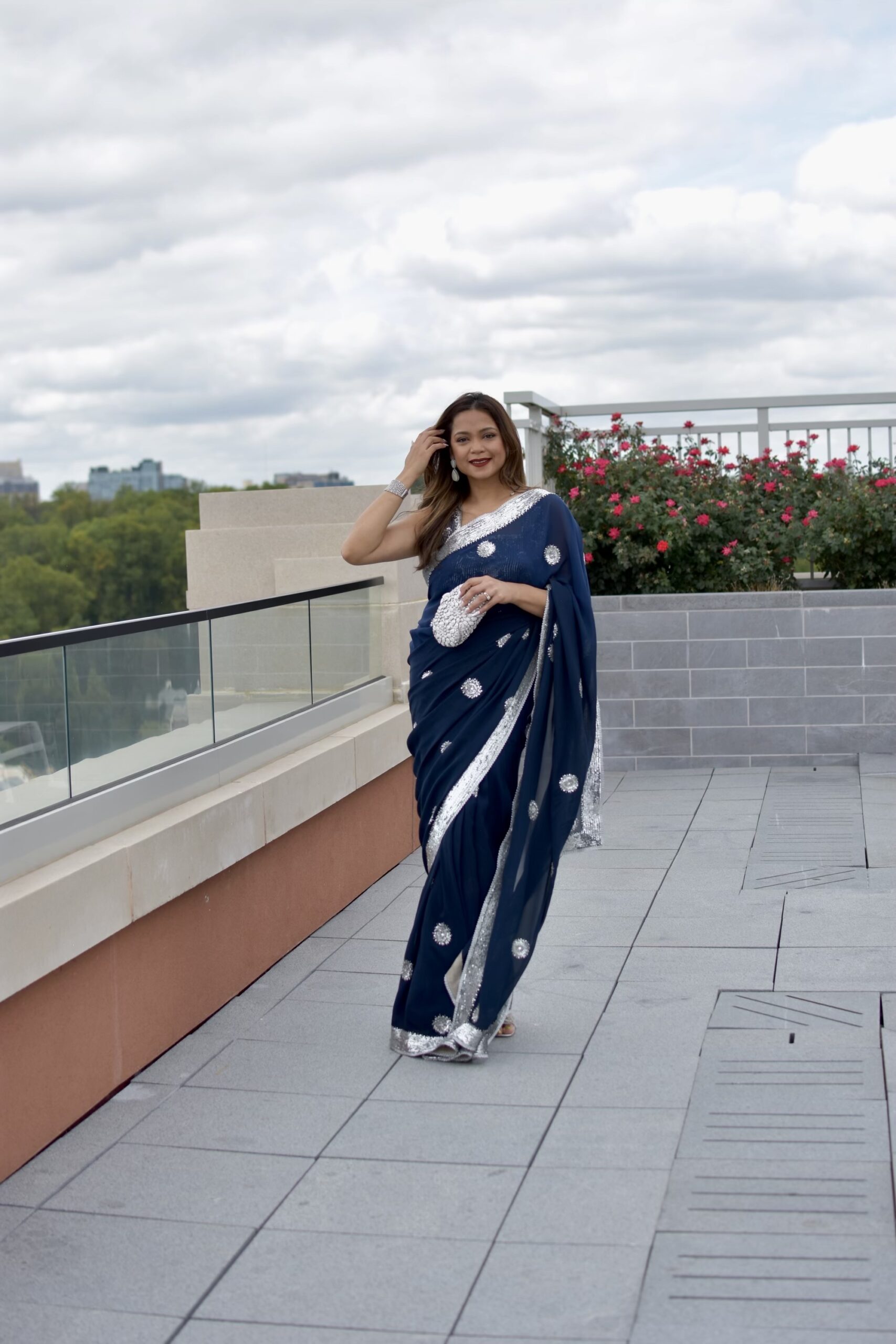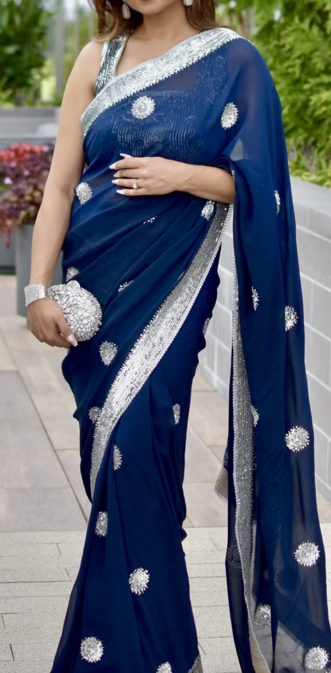 Mandira Curtis pre-stiched midnight blue sari with silver trim and embellishments.