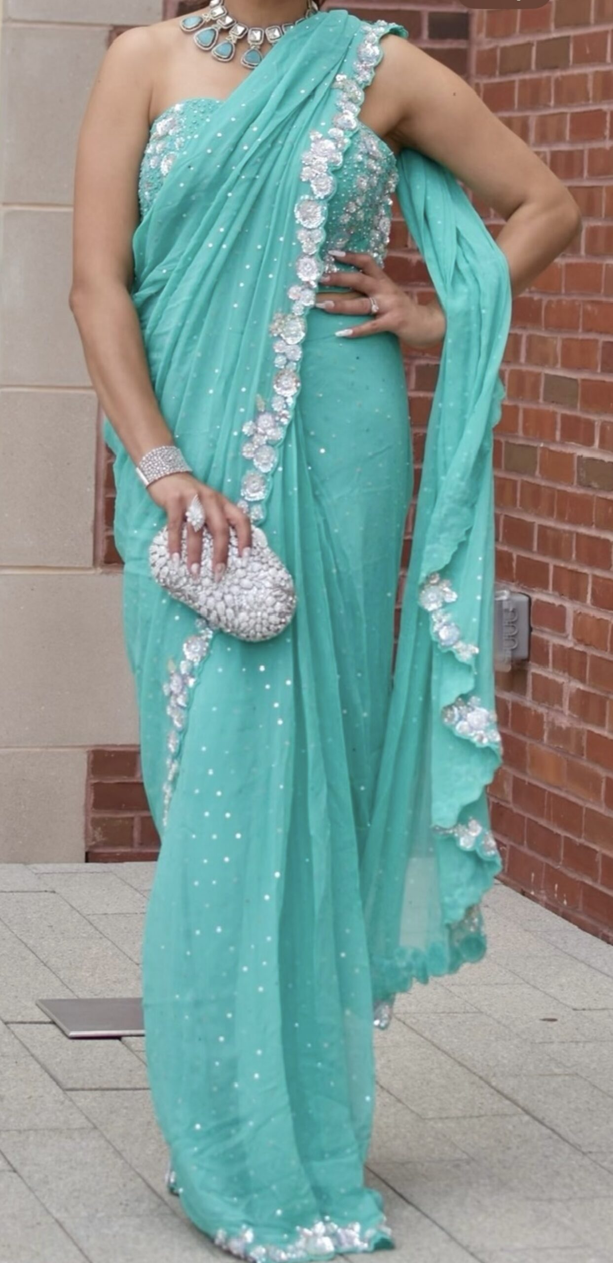Mandira Curtis pre-stitched / draped sari with feather detailed cape and embellishments.