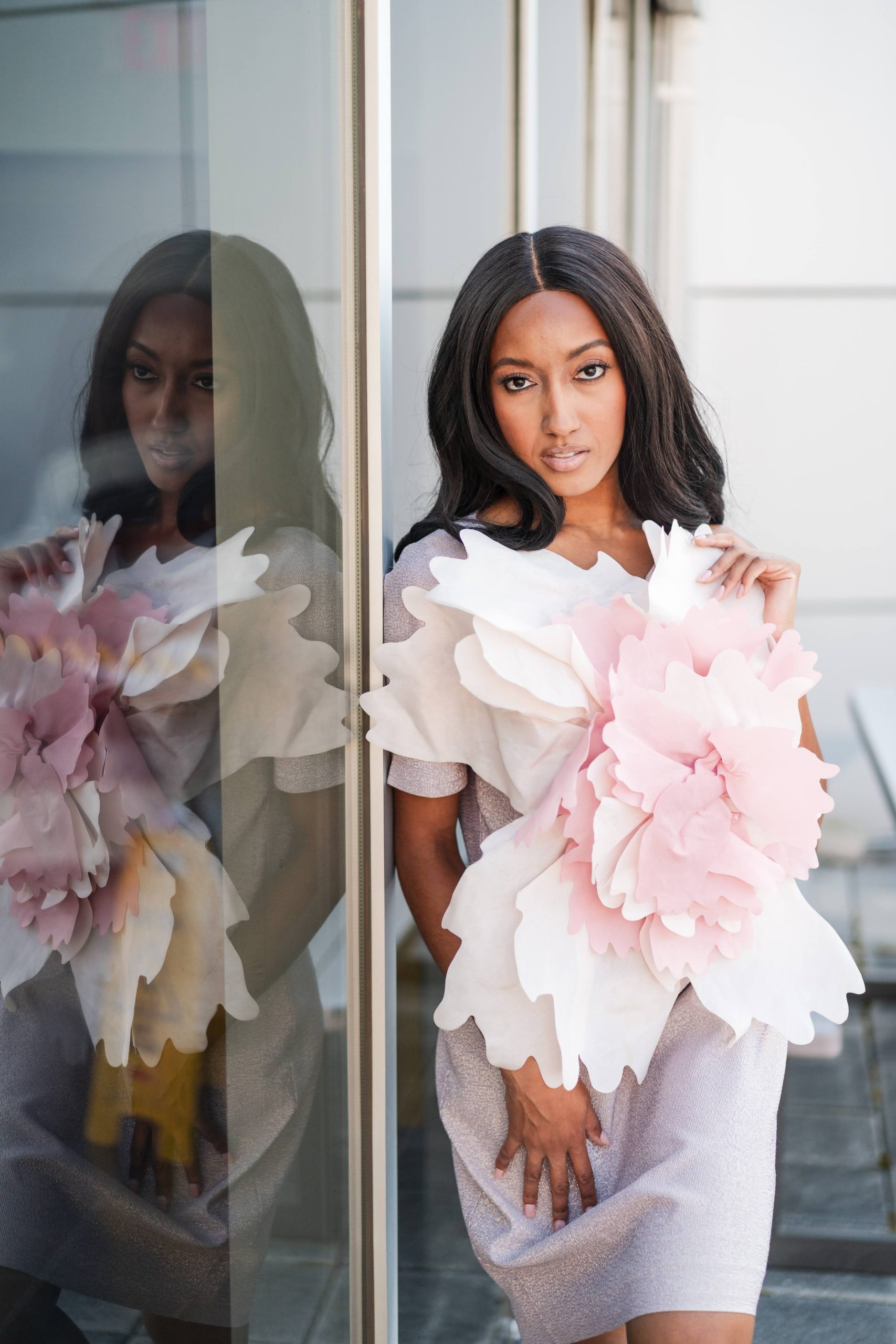 A prominent floral design with oversized, layered petals in a soft pink hue that covers the bodice and extends outward. The skirt portion of the dress appears to be short and fitted, with a textured white fabric that adds contrast to the smooth, delicate appearance of the petals. Overall, it exudes a feminine and elegant vibe.
