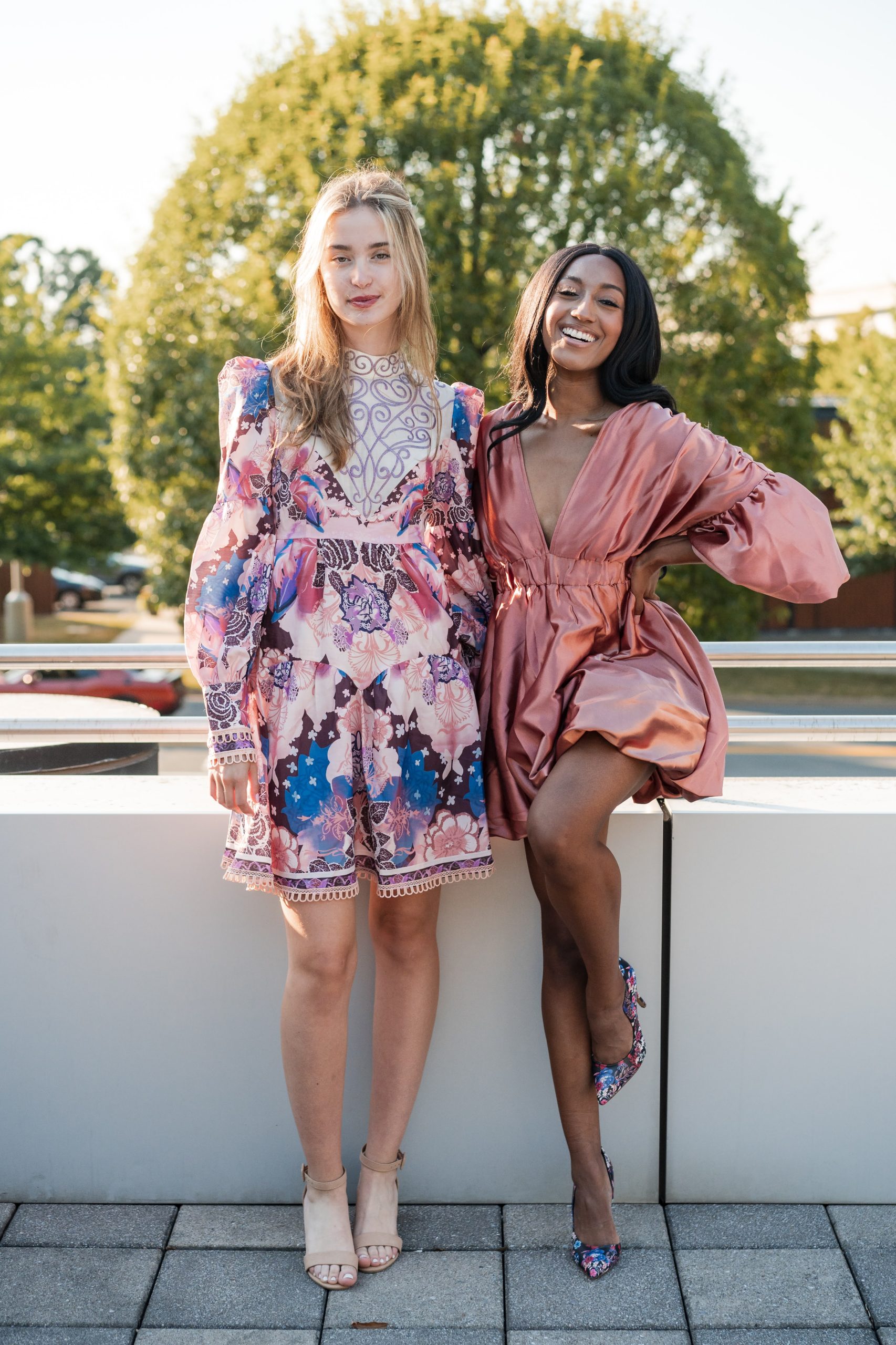 Pink, short, satiny mini dress with a lustrous finish. It features long, voluminous puff sleeves that are gathered below the elbows, creating a dramatic balloon effect. The color of the dress is a soft pink, and it has a deep V-neckline that adds to its feminine allure. The waist is cinched, providing some structure to the otherwise flowy silhouette of the dress. The hemline is a little short, falling to mid-thigh length.