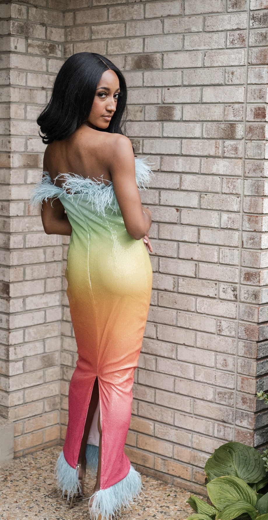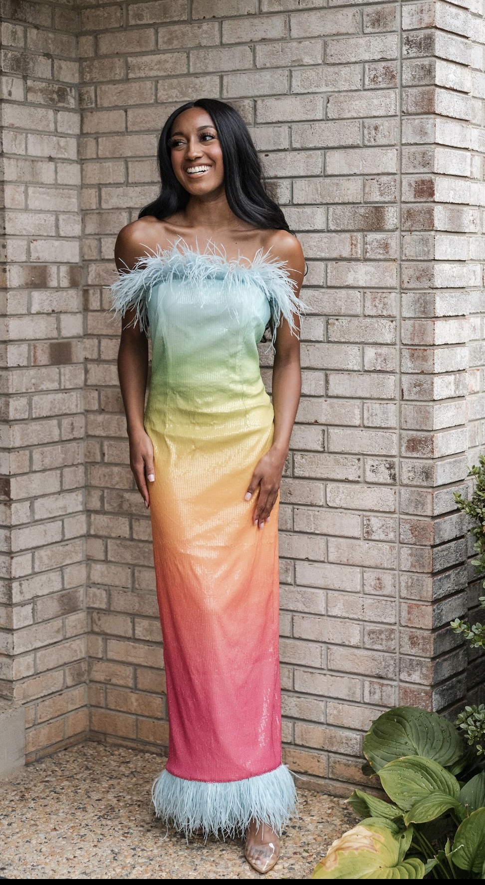 Rainbow Sequin Maxi with Feather Trim [Retails $180]