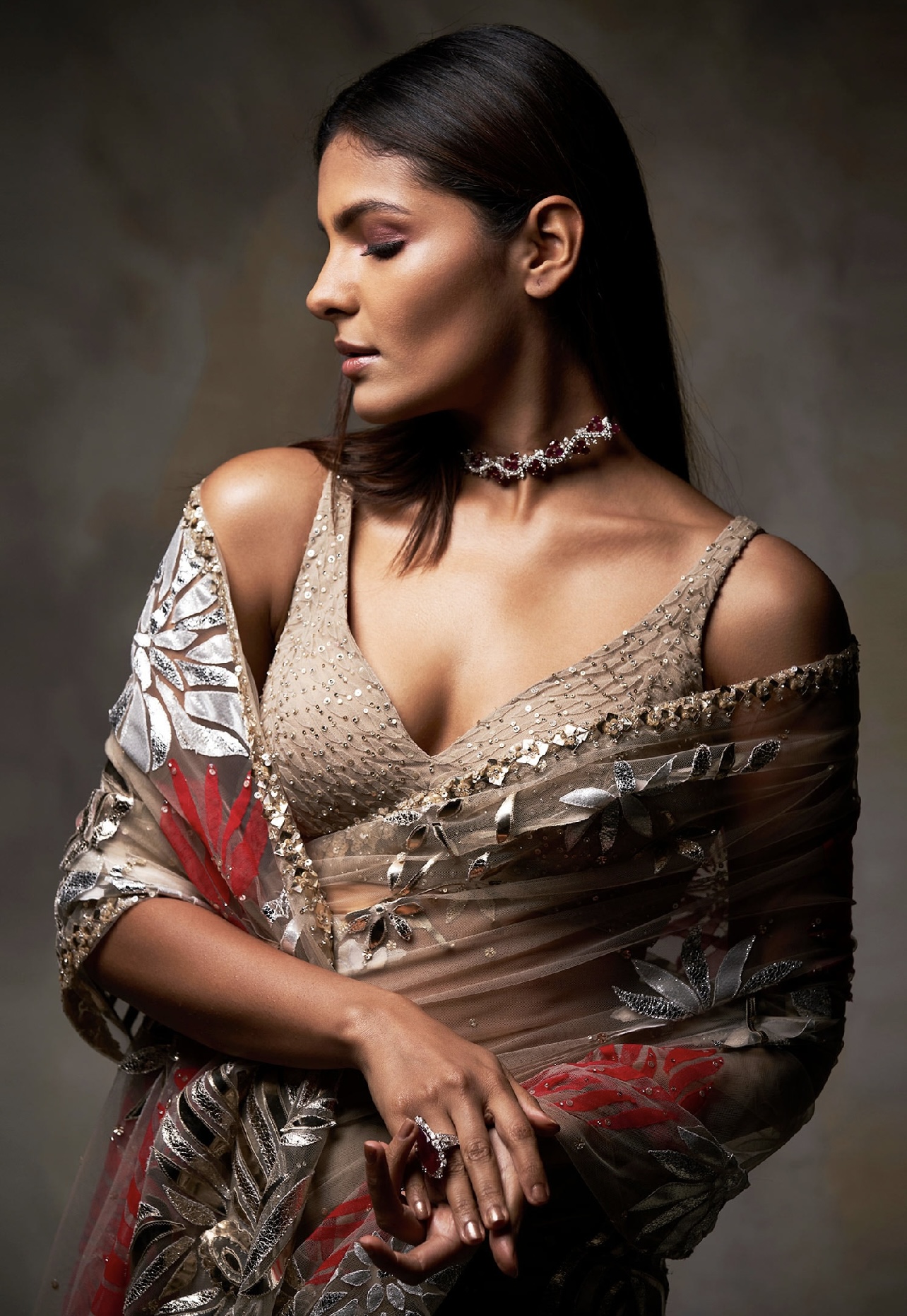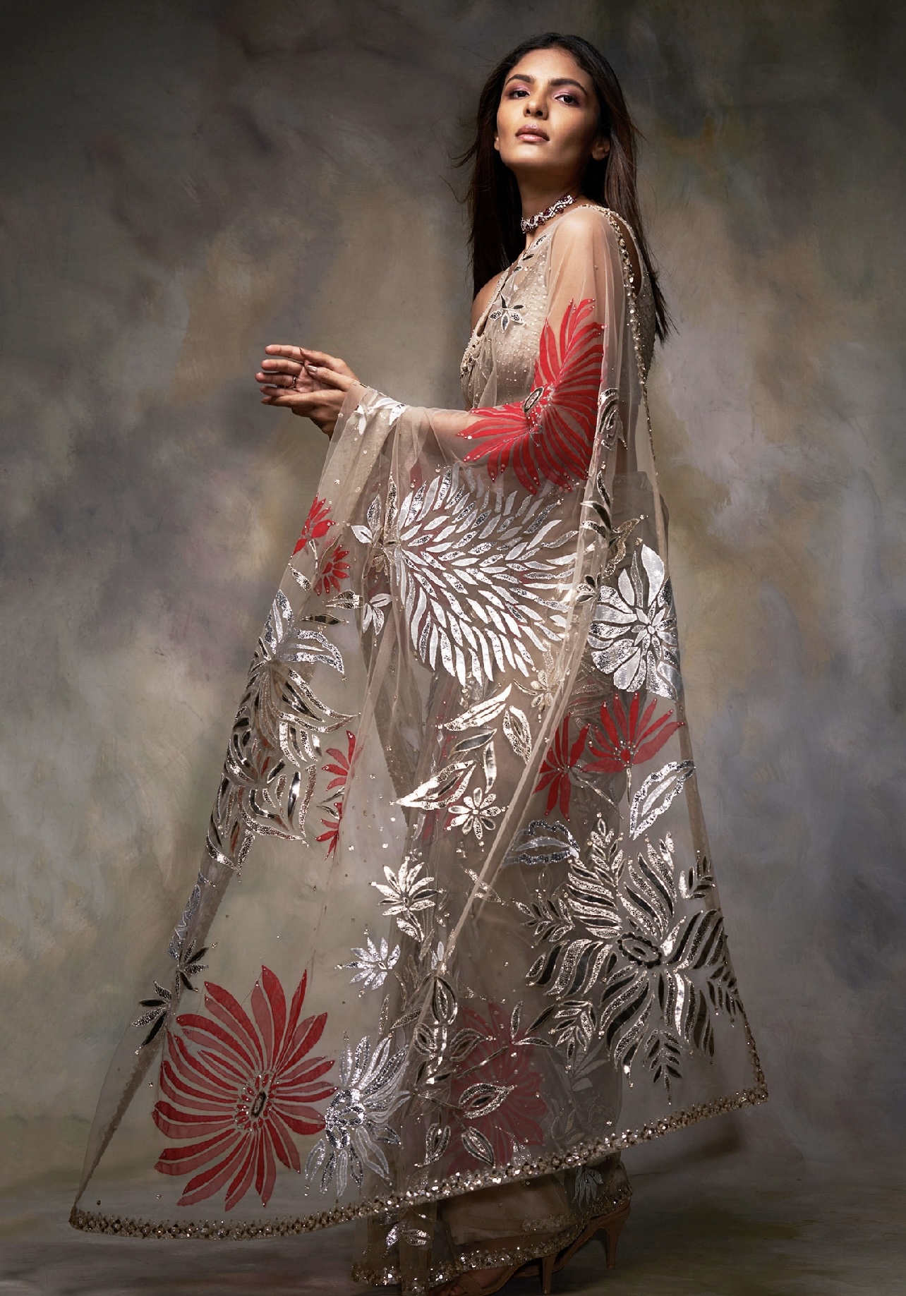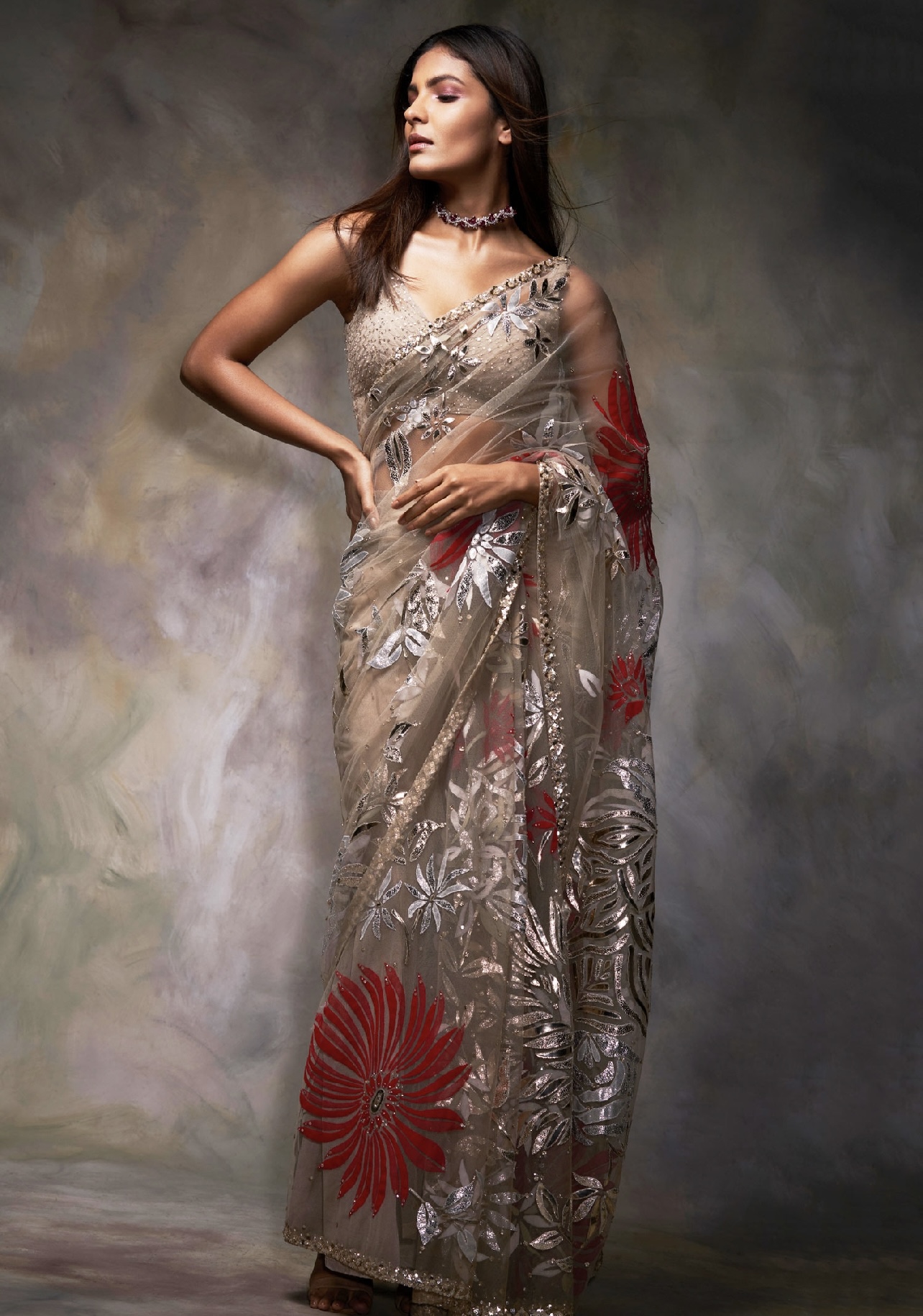The outfit is a stunning traditional Indian sari. The sari is made from a sheer chiffon fabric adorned with intricate silver sequin work and embroidery. The primary colors are shades of grey and silver, with striking red floral accents that add a pop of color. The blouse is sleeveless and matches the sari with similar embellishments and showcases a beautiful design.